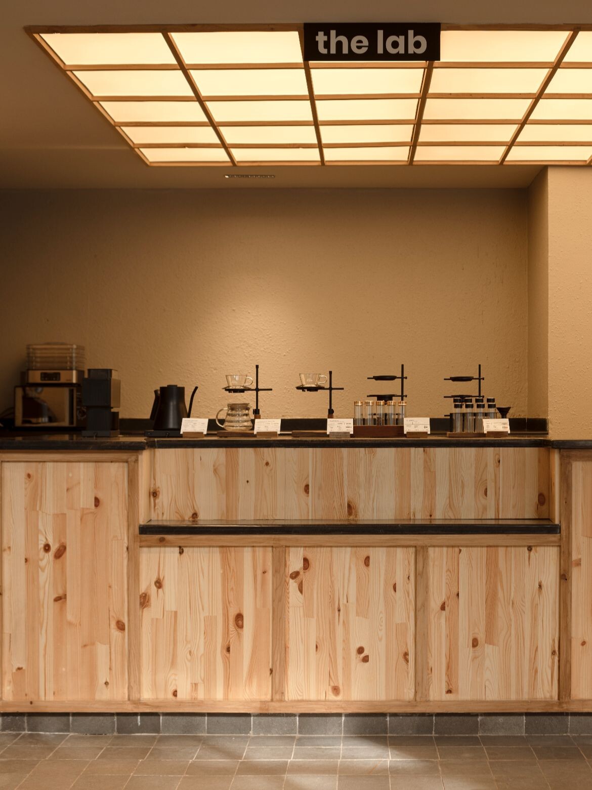 Tall pinewood-framed windows open views to surrounding greenery, allowing natural light to fill the space. A recurring grid motif introduces order and continuity, appearing across floors, walls and ceilings to unify the interior. A 4.8-metre-long timber counter anchors the plan, while seating is varied to suit different modes of occupation, from window nooks and communal tables to high stools on the mezzanine level above.