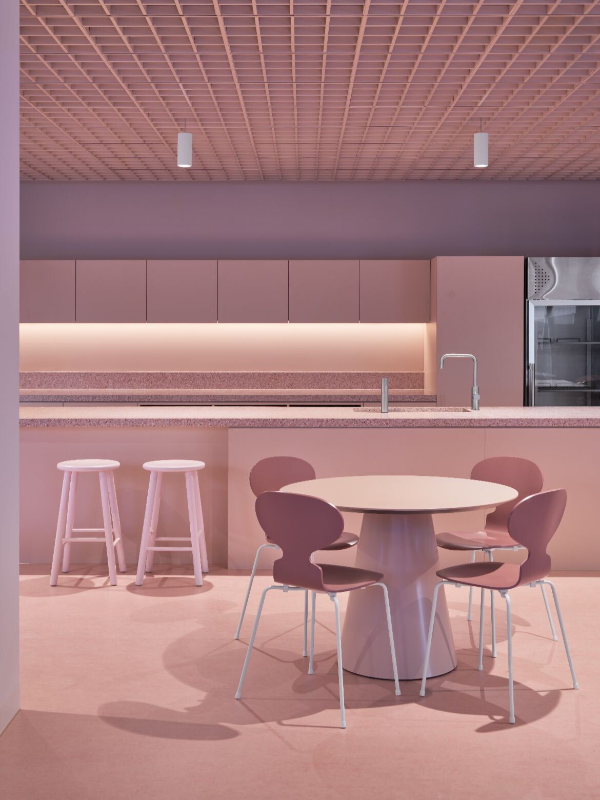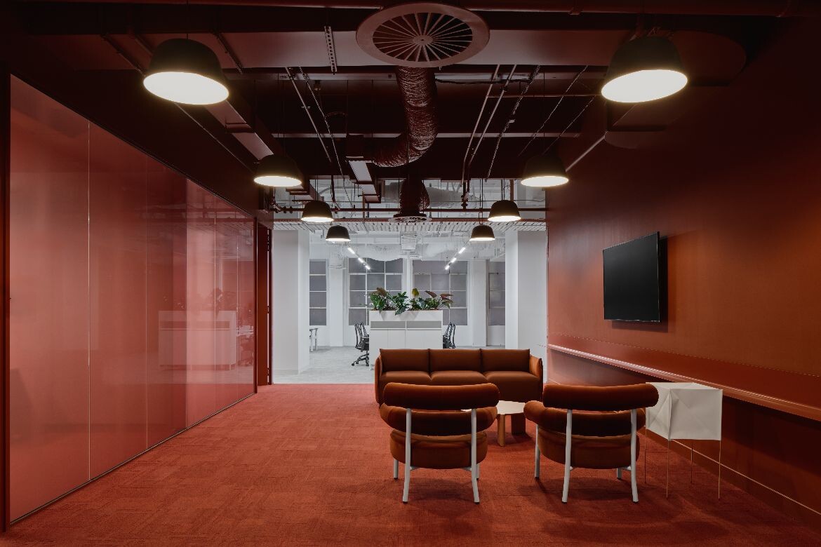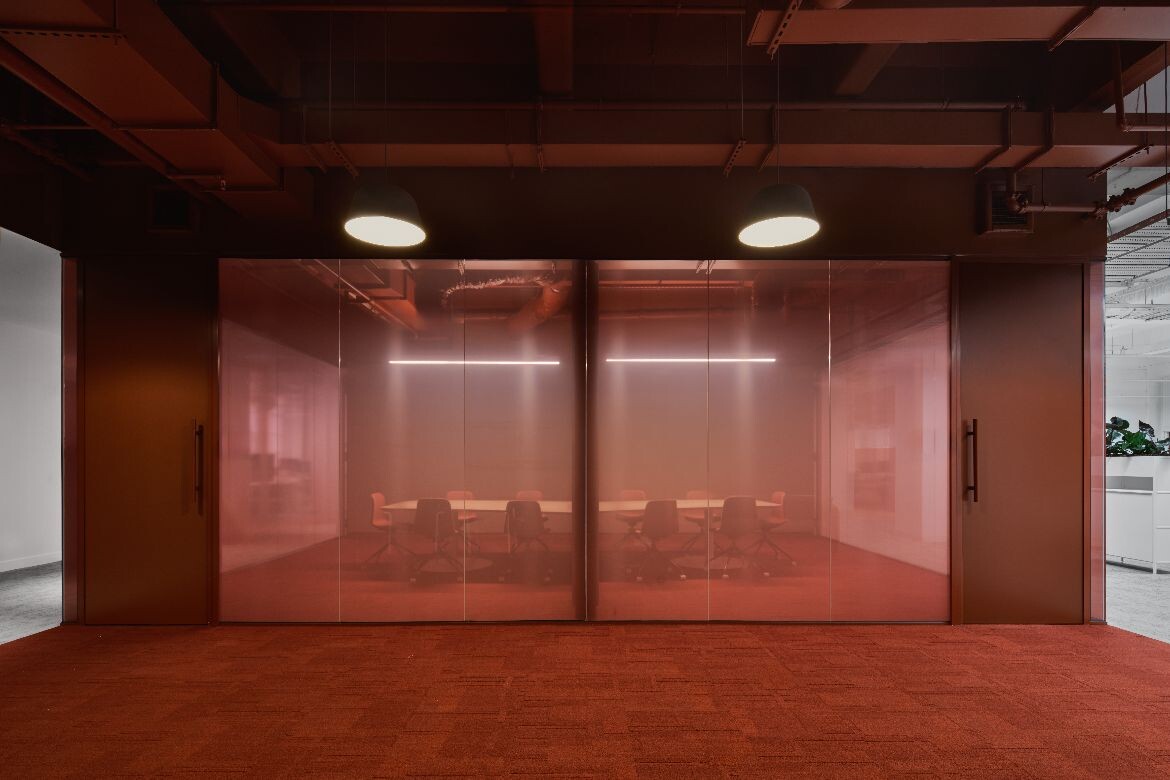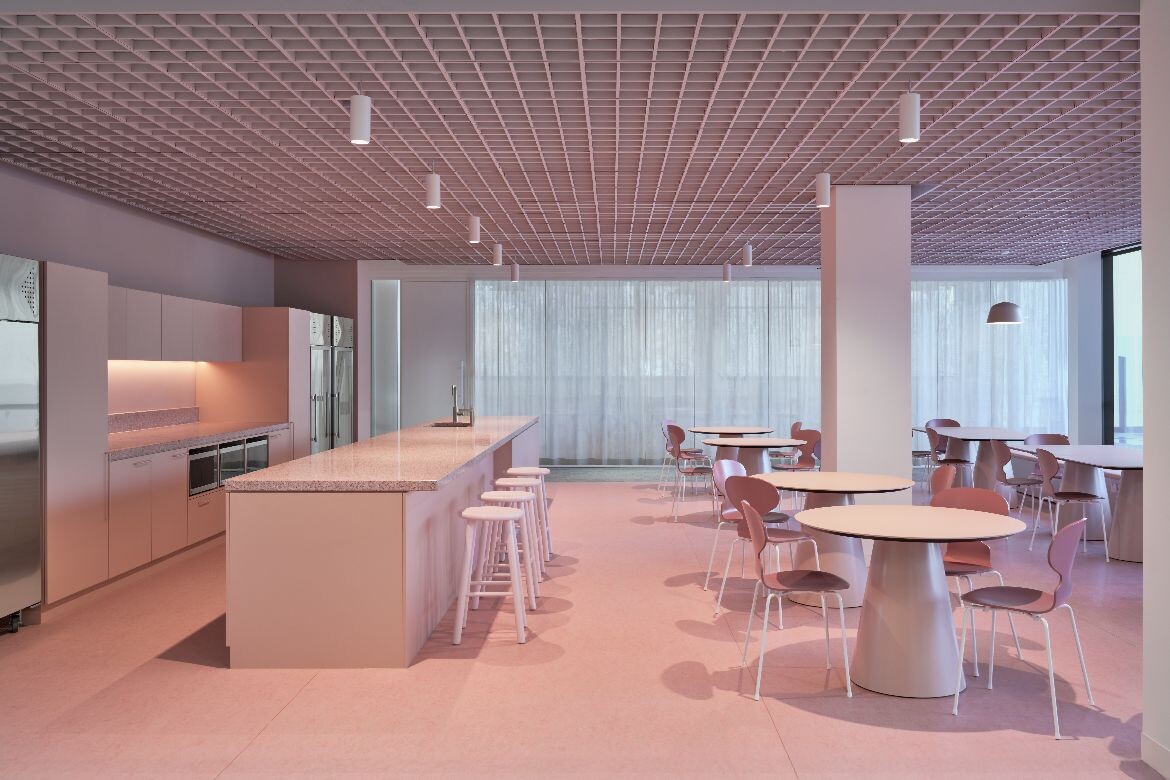 The interior palette draws directly from the building’s heritage fabric, particularly the porcelain tiles of the façade. A predominantly white interior is punctuated with carefully applied colour: a soft mauve-pink defines client spaces on level four, while terracotta and French blue create moments of contrast within meeting rooms and breakout areas.