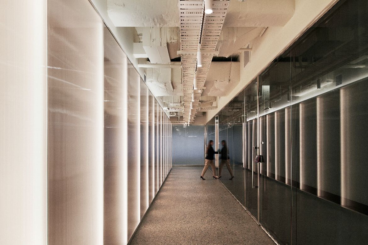Materiality plays a defining role throughout. On the client level, ceilings are painted soft white and the plenum is exposed, lending a sense of openness and scale. The network of pipes and services overhead adds visual complexity rather than detracting from the design.