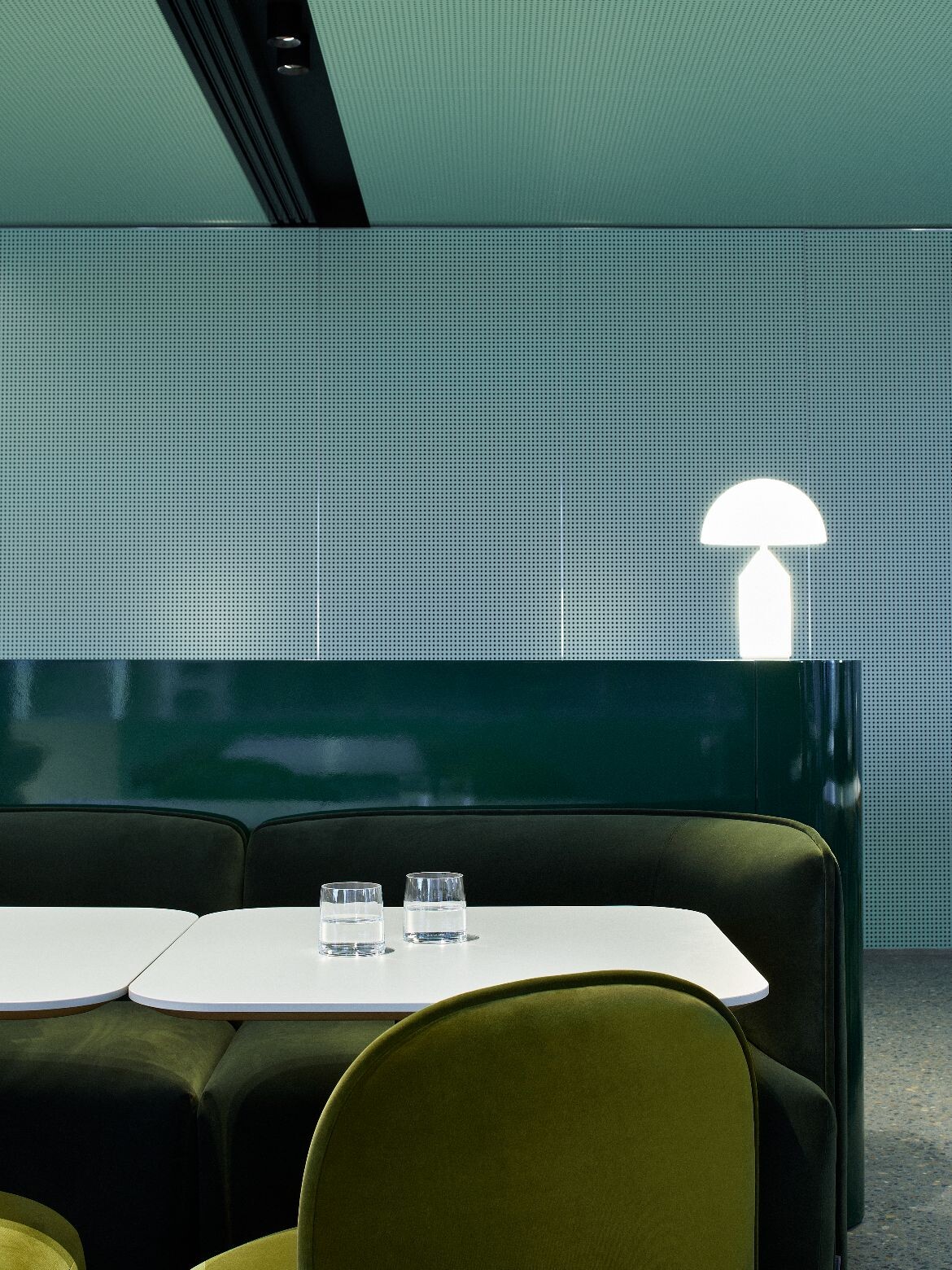 While CBRE’s corporate identity is anchored by deep forest green, the design introduces a nuanced range of complementary green tones. These appear across furniture, soft furnishings and the green reflective Barrisol stretch ceiling in the reception lounge.