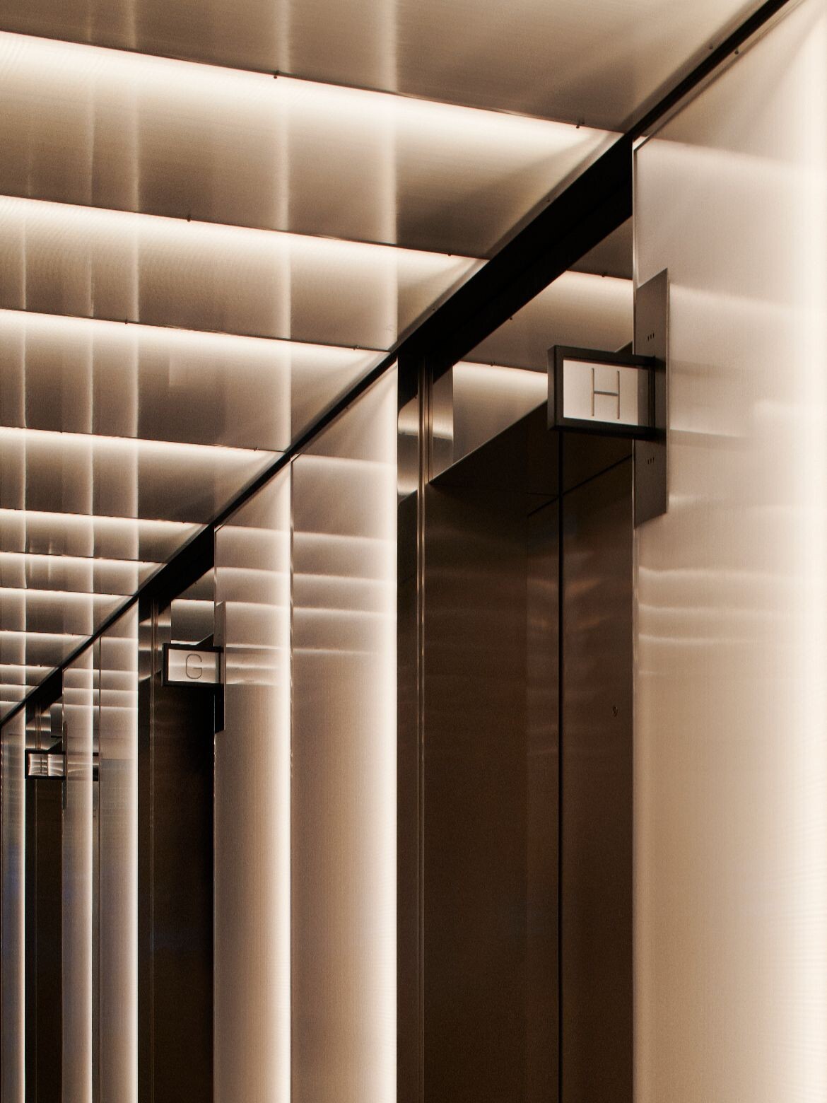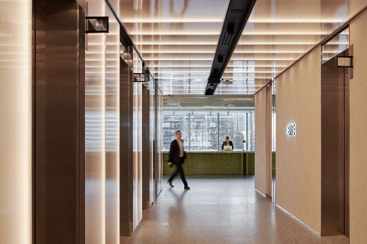 Page notes, “We explored materials not typically associated with workplace interiors and resolved them with a high level of detail. Danpalon, usually a façade material, is used around the core with polished chrome trims and integrated lighting.”