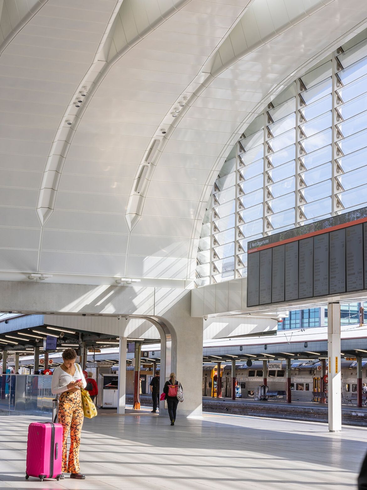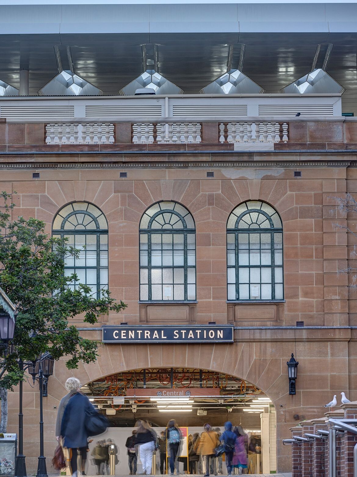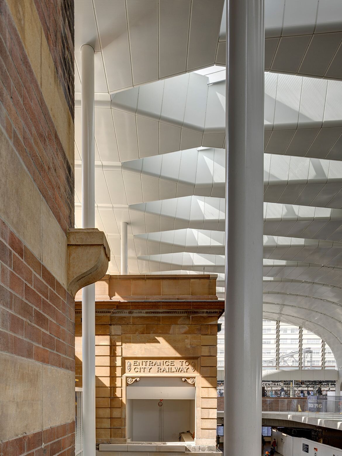 By opening up the concourse vertically, a grand new civic space has been created that prominently frames – or envelops – the heritage Central Electric Building. The space is defined by the elegant, cantilevered curve of the slightly off-white roof structure, which maintains a multilayered conversation with the station’s heritage. Its materiality and colour are juxtaposed with the sandstone and brick facades at the very same time as its curvaceous language references the arches found throughout the station.