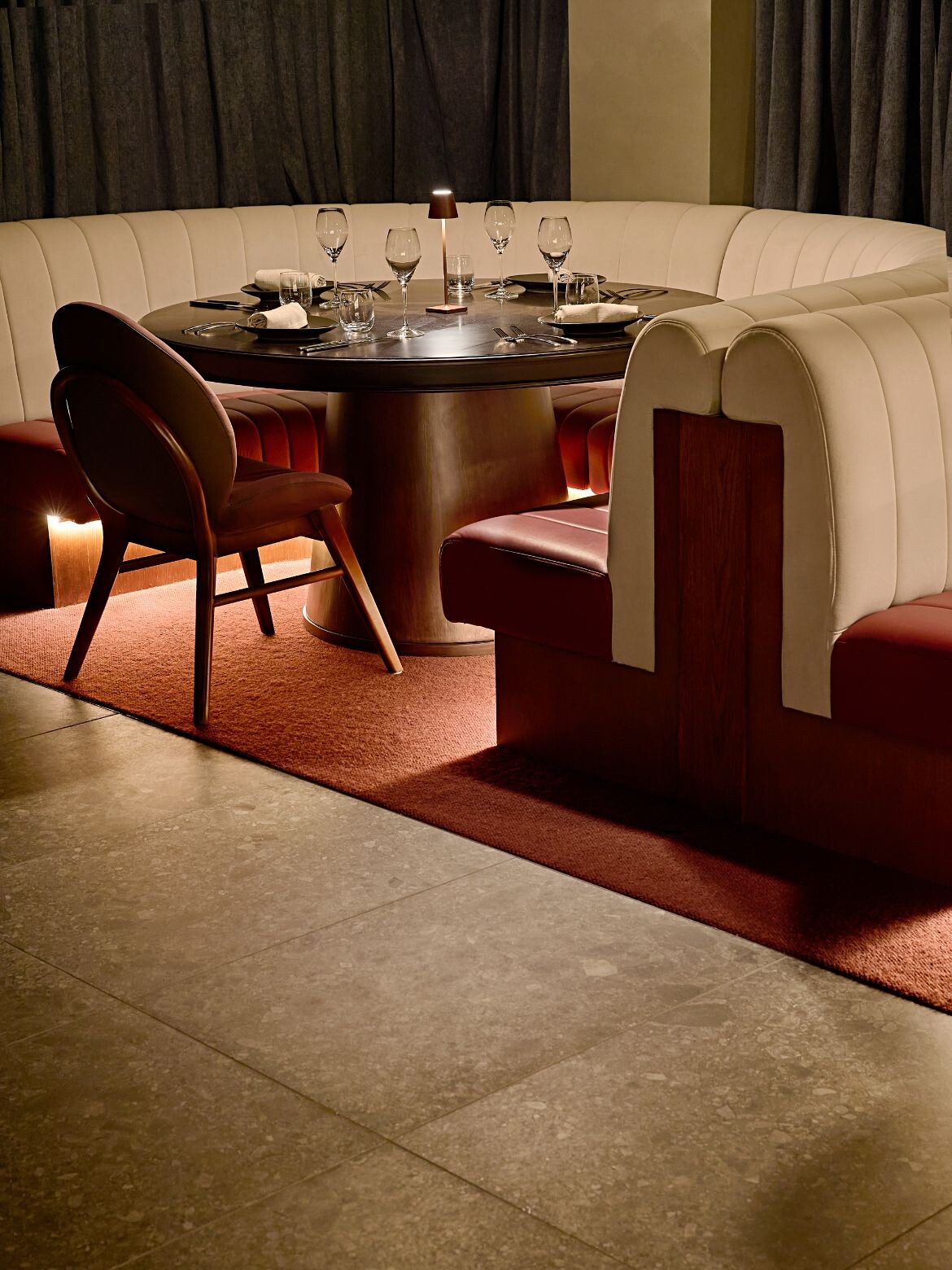 “The client envisioned Ministry of Crab as a theatre, with the open kitchen at centre stage,” says Goh. “Certain Sri Lankan dishes involve a highly performative preparation process, so the dining space was designed to frame these moments. Warm colours and expressive lighting help amplify the sense of spectacle.”