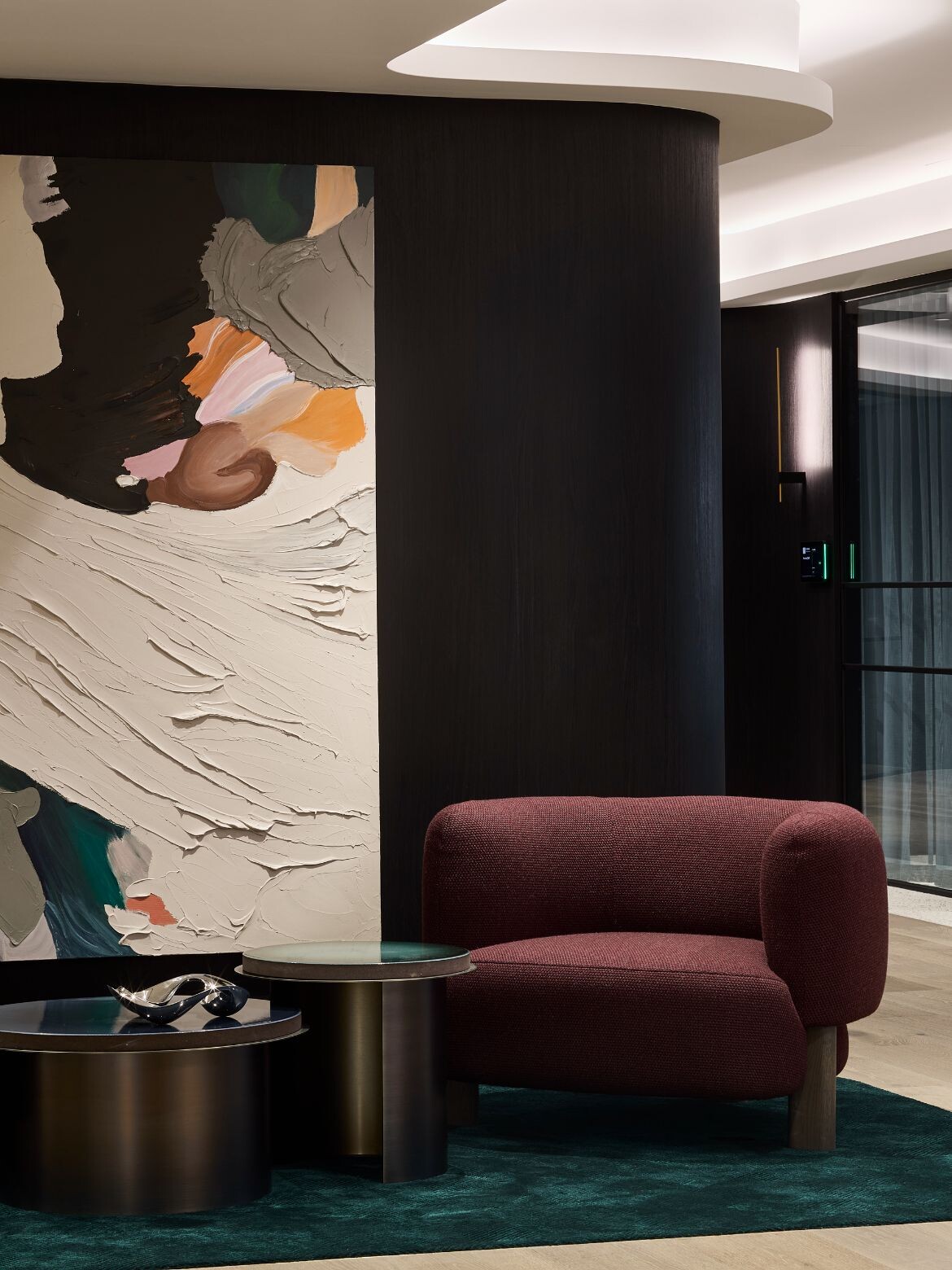 While the dark veneer grounds the space in sophistication, it’s the layering of materials that delivers the ‘wine bar’ feel Serruto was after. Forest-toned carpets, crushed velvet chairs, textured tiles and soft wall lighting build a sensory, almost residential warmth into the workplace. Functionality is factored into every decision. Multiple seating arrangements – curved booths to height-adjustable executive desks – support different working styles.