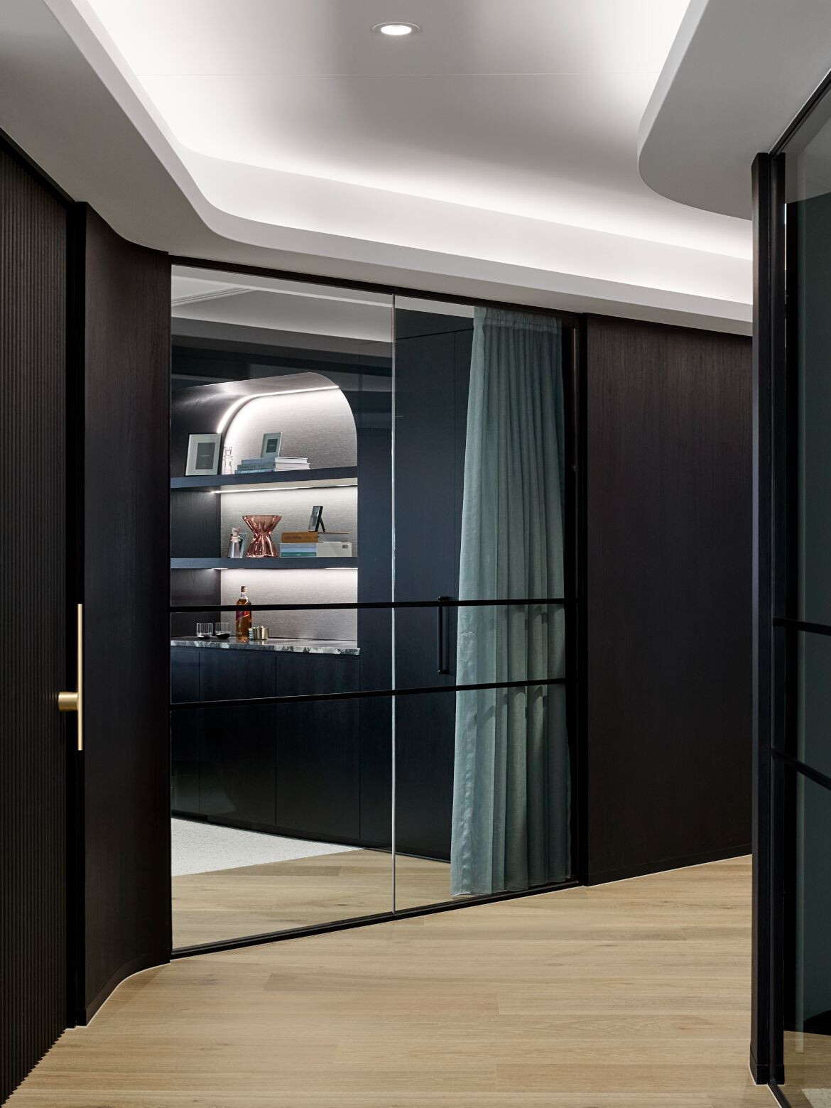 Central to achieving the desired hotel luxe aesthetic for McCormack is the judicious use of Elton Group’s Eveneer Ravenna, in both WoodWall and Raw finishes. A key material as part of the whole, it was chosen for its matte texture, subtle structured grain and deep, sophisticated tone. “It worked so well with all the other materials,” Serruto says, adding that “it wasn’t too overbearing, and it complemented the stone and lighter floorboard beautifully”.