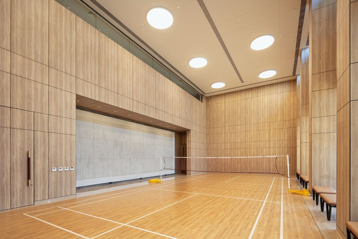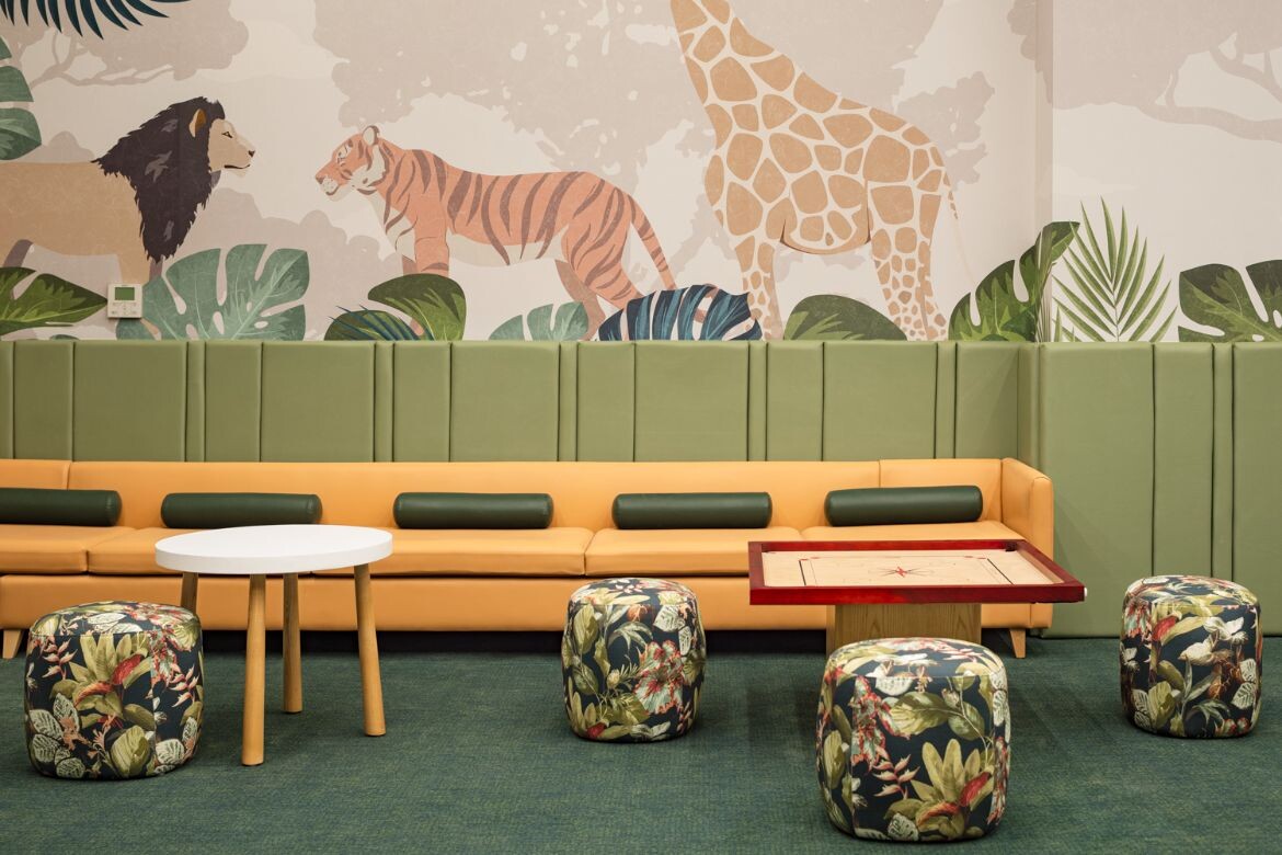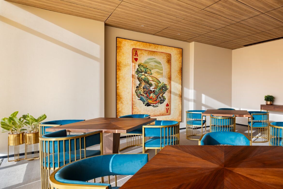 On the other side of the reception is the squash court with walls and floor swathed in timber. The mellow honey tones of the materiality make this a light and bright area that contemporises this ubiquitous space. In the gaming lounge, a giant-sized, custom-made playing card artwork imbues the space with style and adds a touch of whimsy.