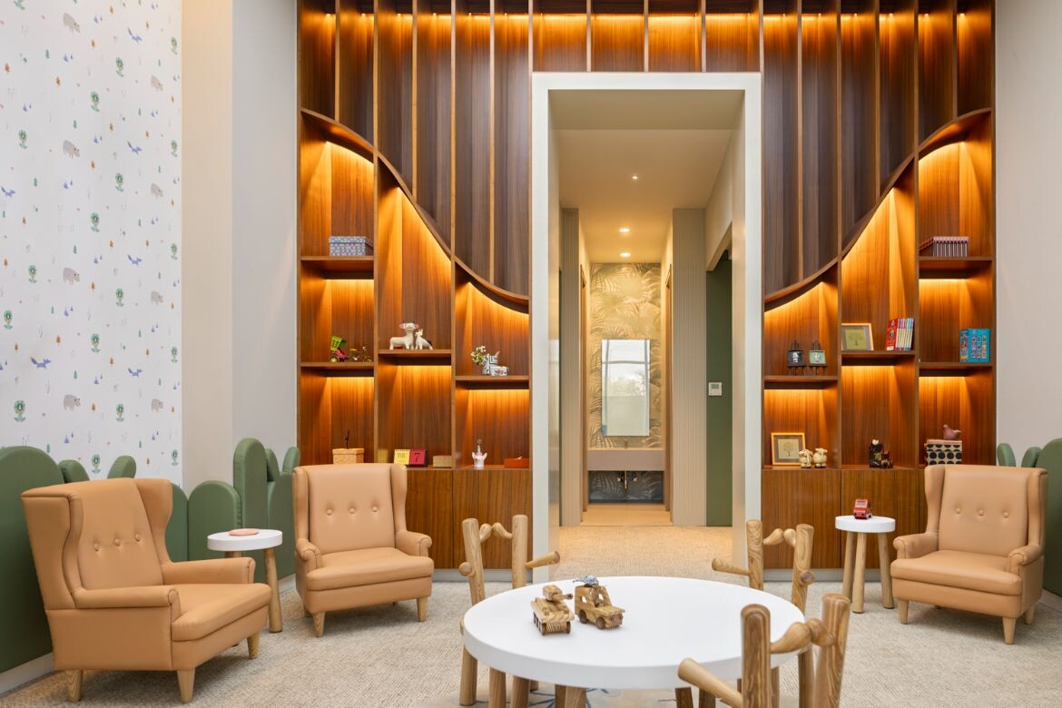 On the podium level is the all-day dining café, games lounge and children’s party area. Meanwhile, the first floor is a dedicated wellness space comprising gym, yoga room, spa, hair salon, steam rooms and sauna.