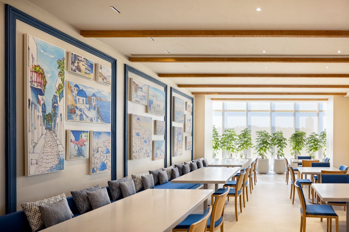 The podium level with dining and entertainment areas is awash with cream, white and blue, the design drawing inspiration from the architecture of Mykonos. The walls are covered with artworks of the Greek island and the timber tables, blue fabric covered chairs and an abundance of textured and patterned cushions on the expansive banquette make this a space in which to relax with friends and family.