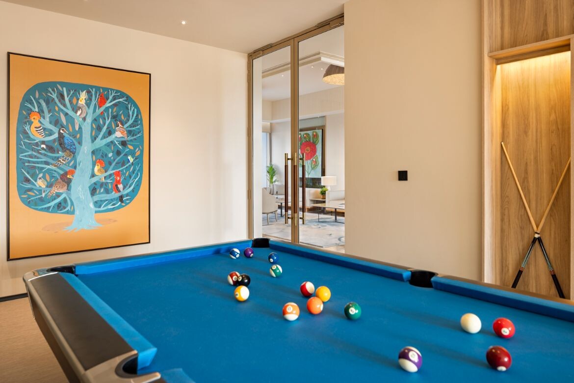 The Games room also extends the homage to Mykonos with a spectacular blue billiards table that is set to perfection against the cream walls and warm hued timber floor.