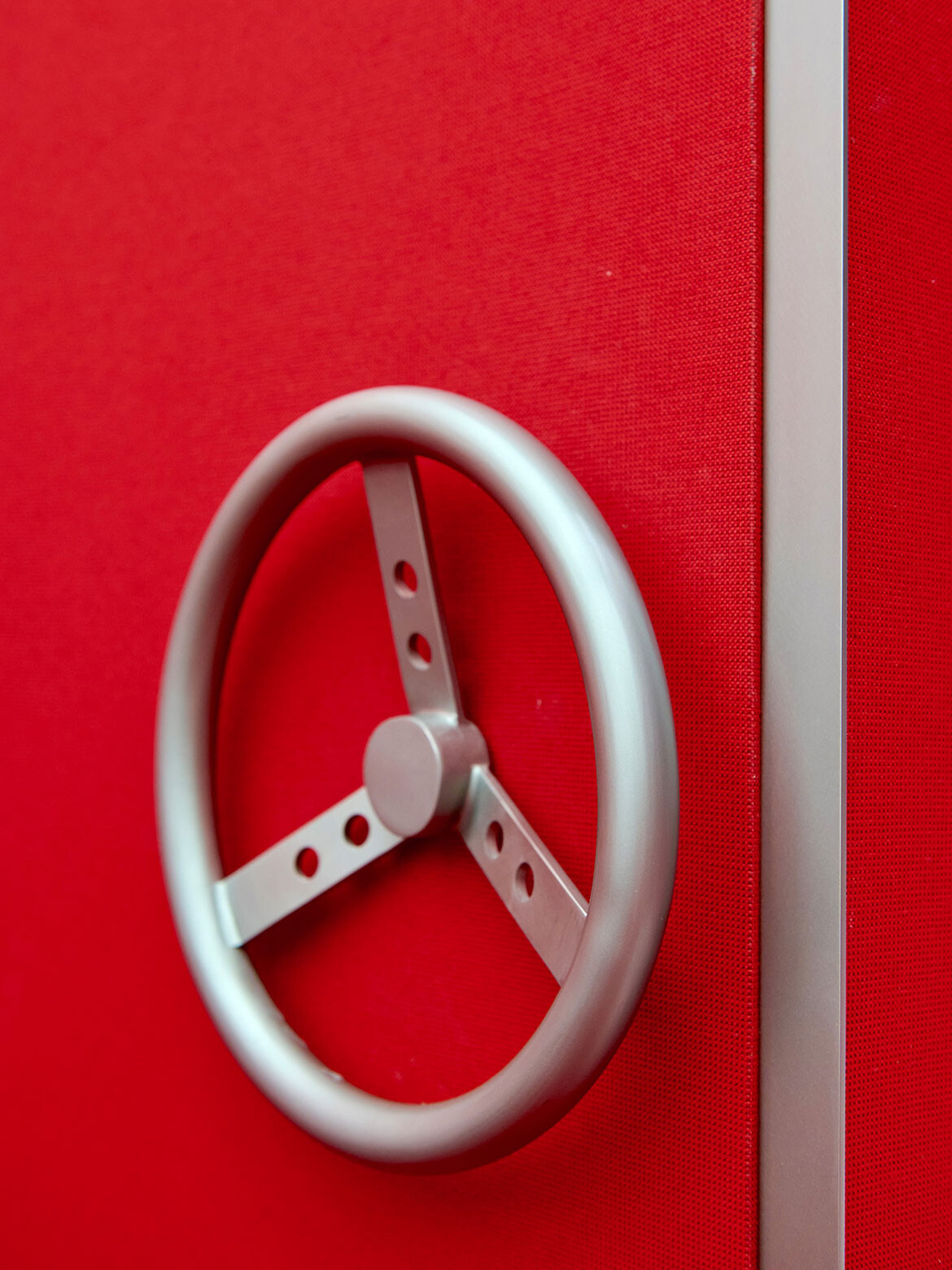 Echoing the form of a luggage carousel, vertical rubber flaps conceal a rear opening — a playful detail that evokes the familiar ritual of baggage collection after a flight.