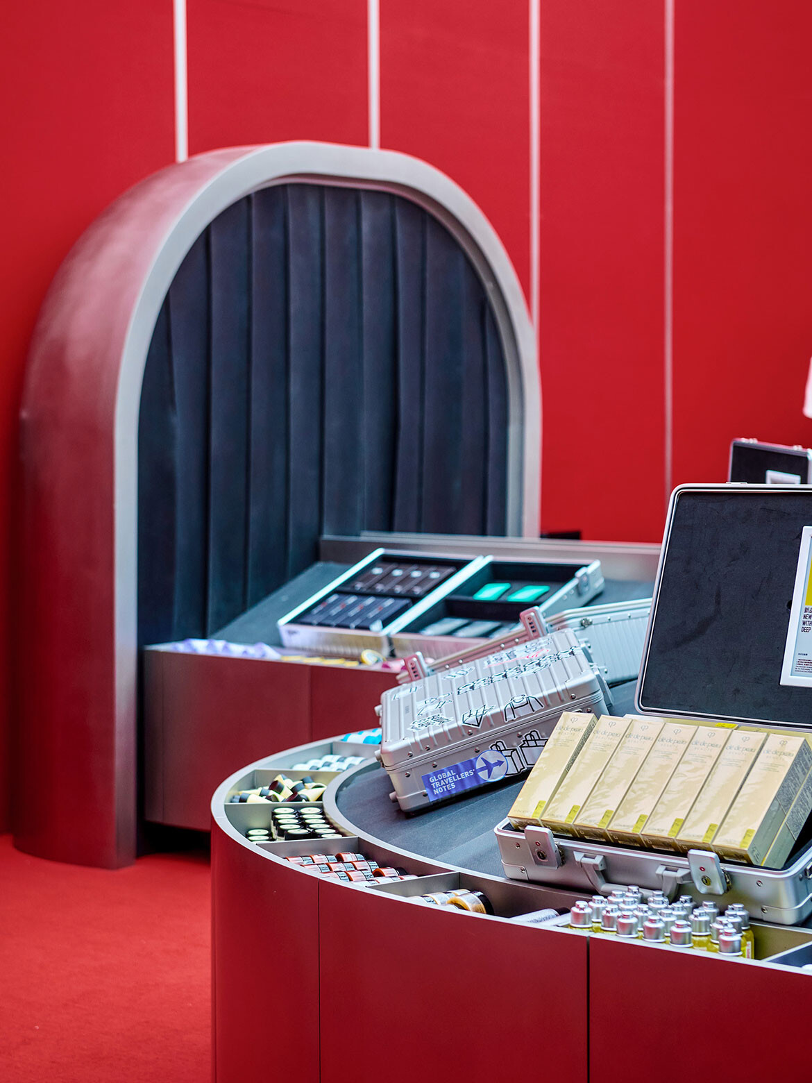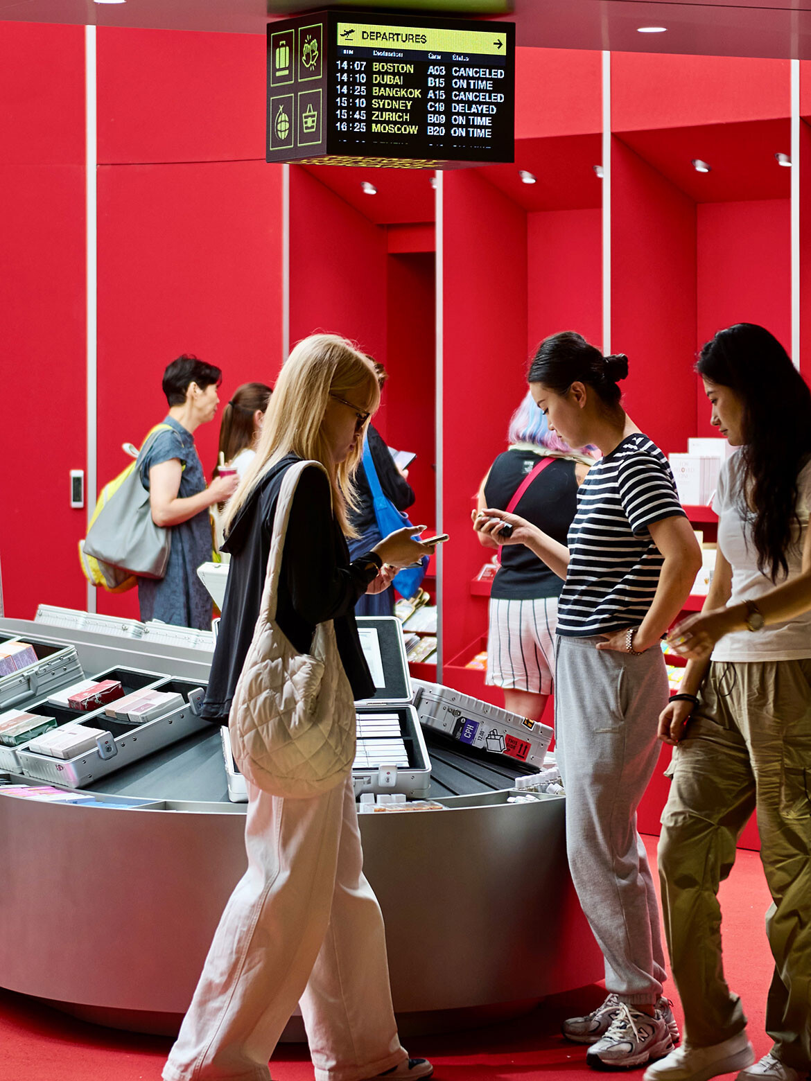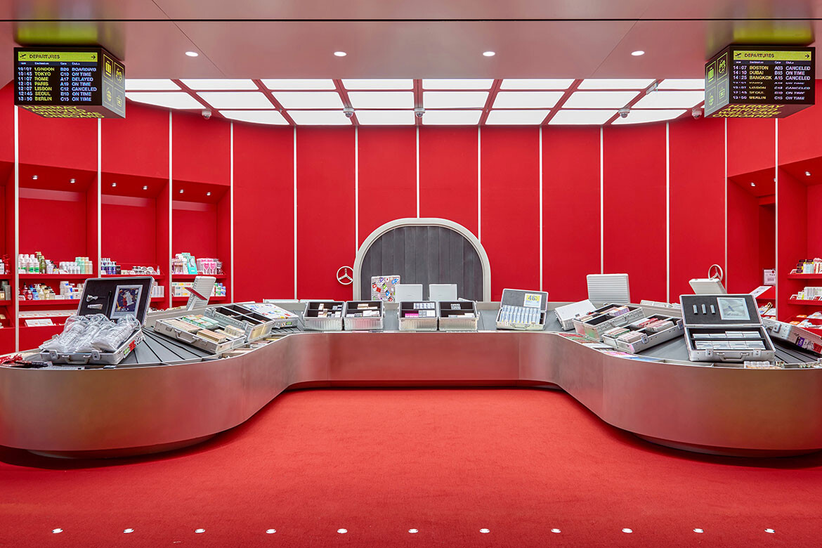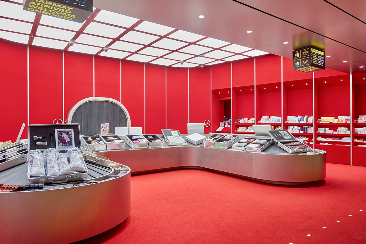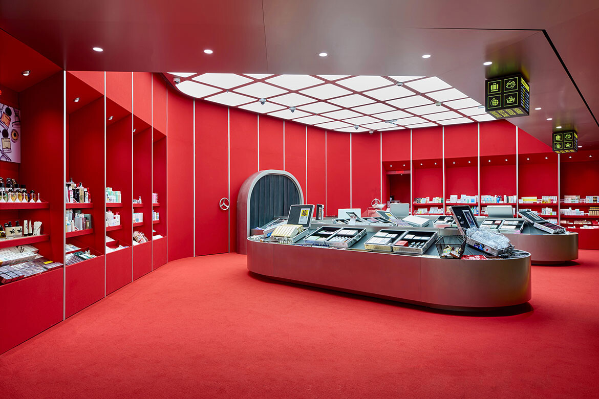 Making a bold statement inside Shanghai’s Hongqiao International Airport, the store appears as a glowing red beacon amid the neutral tones of the terminal. Its vivid presence draws the eye of passing travellers, inviting them to pause, explore and purchase. Reflecting the dynamic energy of airport movement, HARMAY Hongqiao offers a kinetic retail experience inspired by luggage systems and display belts.