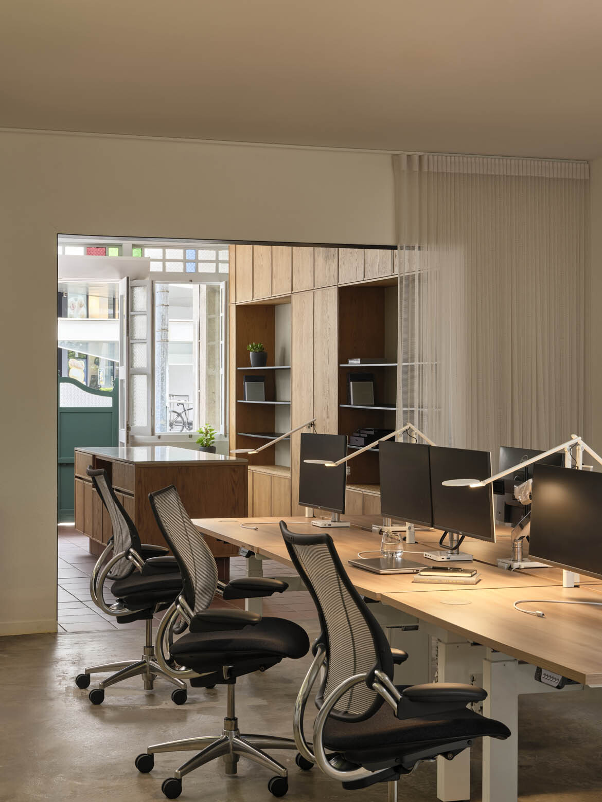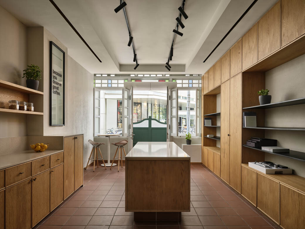 Humanscale’s new space incorporates two shophouses, creating a generous ground-floor layout that blends modern functionality with the historic character of the building. The showroom features two air wells that fill the space with natural light, a stained-glass frontage with traditional windows and expansive rectangular windows that provide a welcoming street presence.