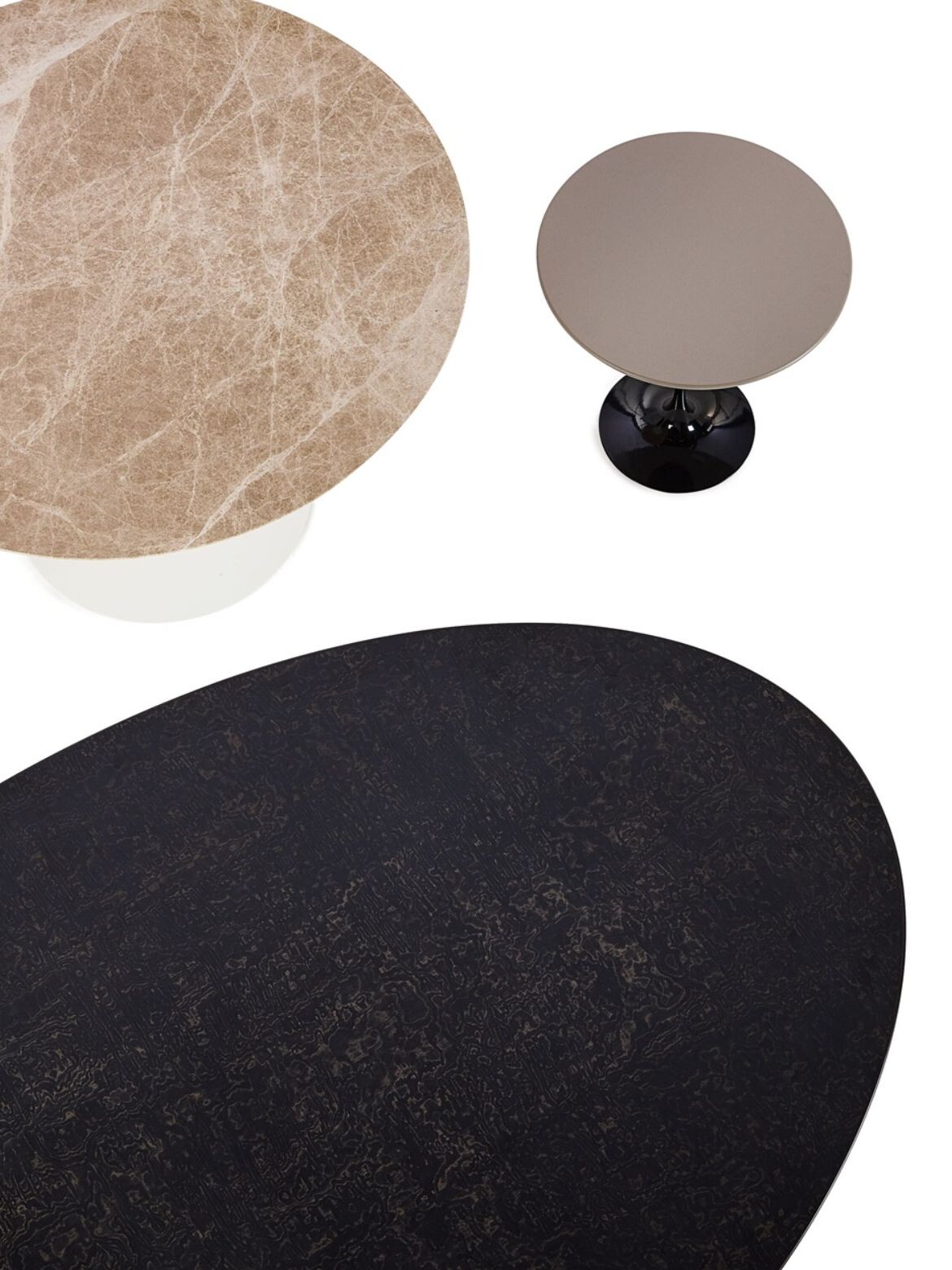 Moreover, the Saarinen Pedestal Collection demonstrates how heritage pieces can be reinvigorated without compromising their original integrity. The introduction of three new finishes – Topo Noir Veneer, Emperador Light Marble, and Modern Clay laminate – allows Saarinen’s purist design to express itself in a fresh, contemporary yet refined manner. The Topo Noir, with its deep black mesmerising grain pattern crafted from reconstituted wood remnants, brings a sustainability mindset to a classic design. Emperador Light Marble adds warmth and delicate light brown veining that complements natural wood tones, while Modern Clay’s innovative soft touch, anti-fingerprint surface addresses the practical demands of high-use environments without sacrificing sophistication.