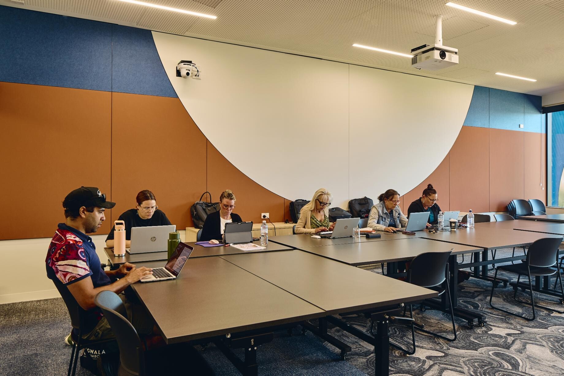 This balance between creative freedom and technical precision sits at the heart of the Milliken Couture process. PrintWorks™ technology can operate across vastly different scales and design languages, blending colour exactly, scaling pattern and texture without losing detail – as evident in the brushstrokes that remain visible in the flooring of the Munarra Centre for Regional Excellence. “Everyone was amazed at how well their images were interpreted,” says Wilson. “The earthiness and texture of the carpet tiles made their work dance.”