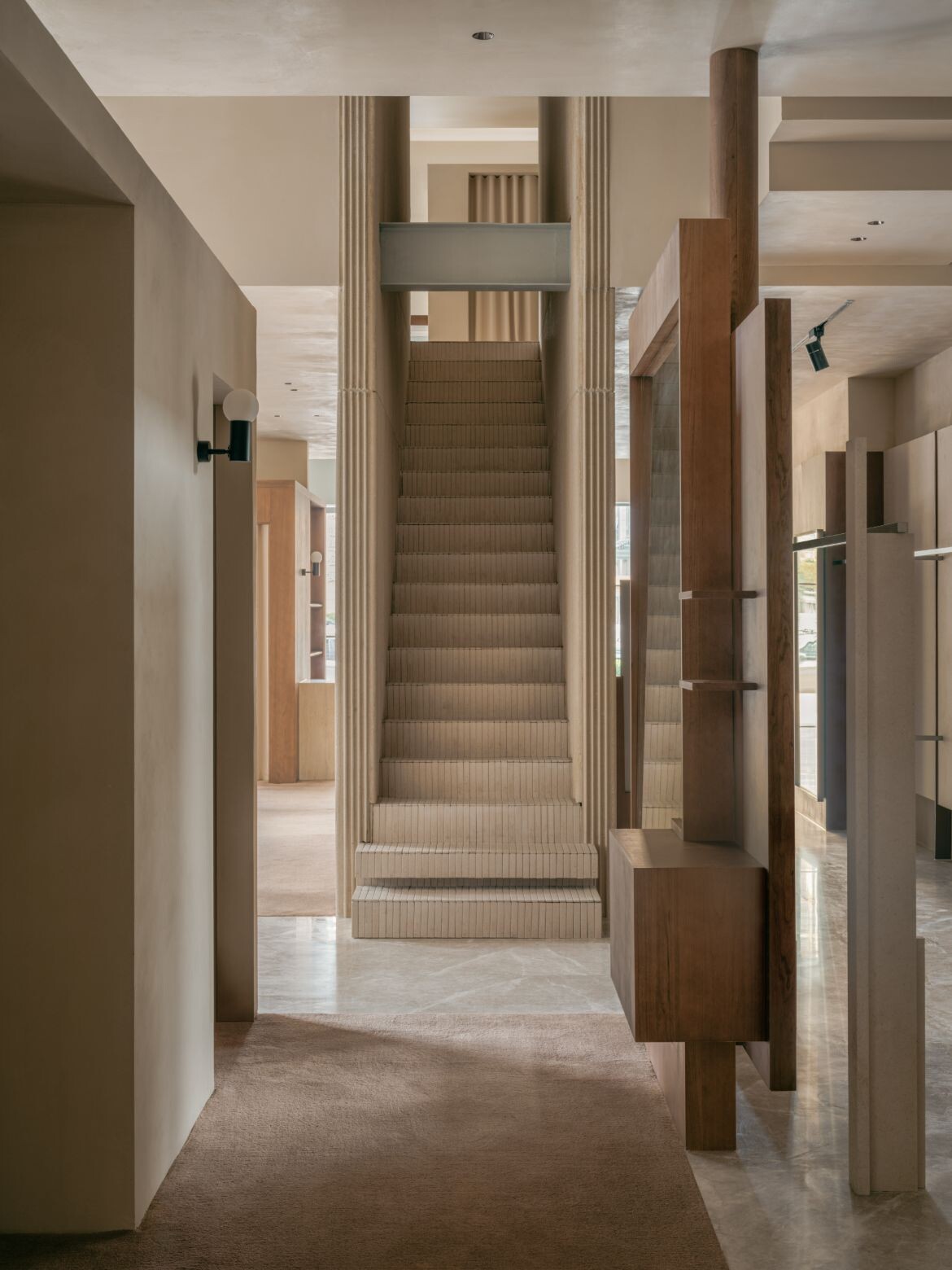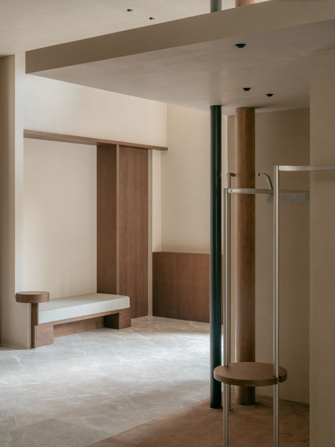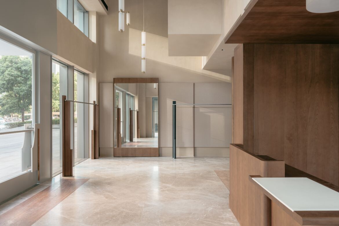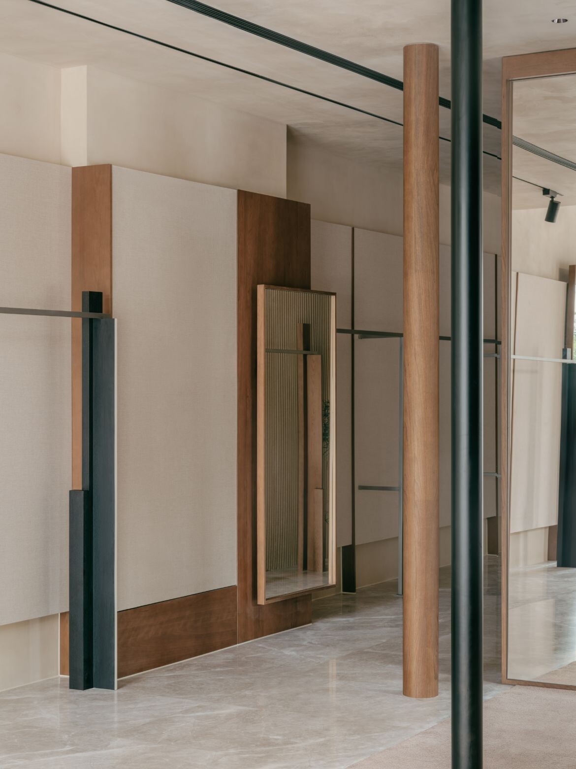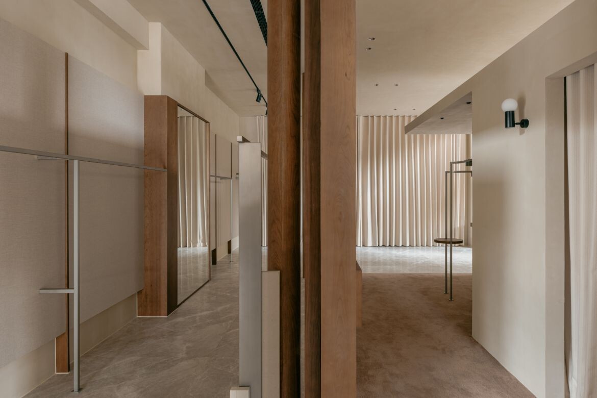 The approach introduces dual rectangular volumes, assigning the outer glass views to distinct spatial units. Structural variation emerges through the interplay of staggered heights in these zones. The former ceiling height of seven metres is retained in the area near the glass façade, maintaining a sense of openness while preventing the space from feeling overly segmented. The latter is tiered, with a multifunctional second floor that accommodates display, office and storage functions. This zoning creates clear circulation pathways and keeps the open shopping area separate from more private spaces.