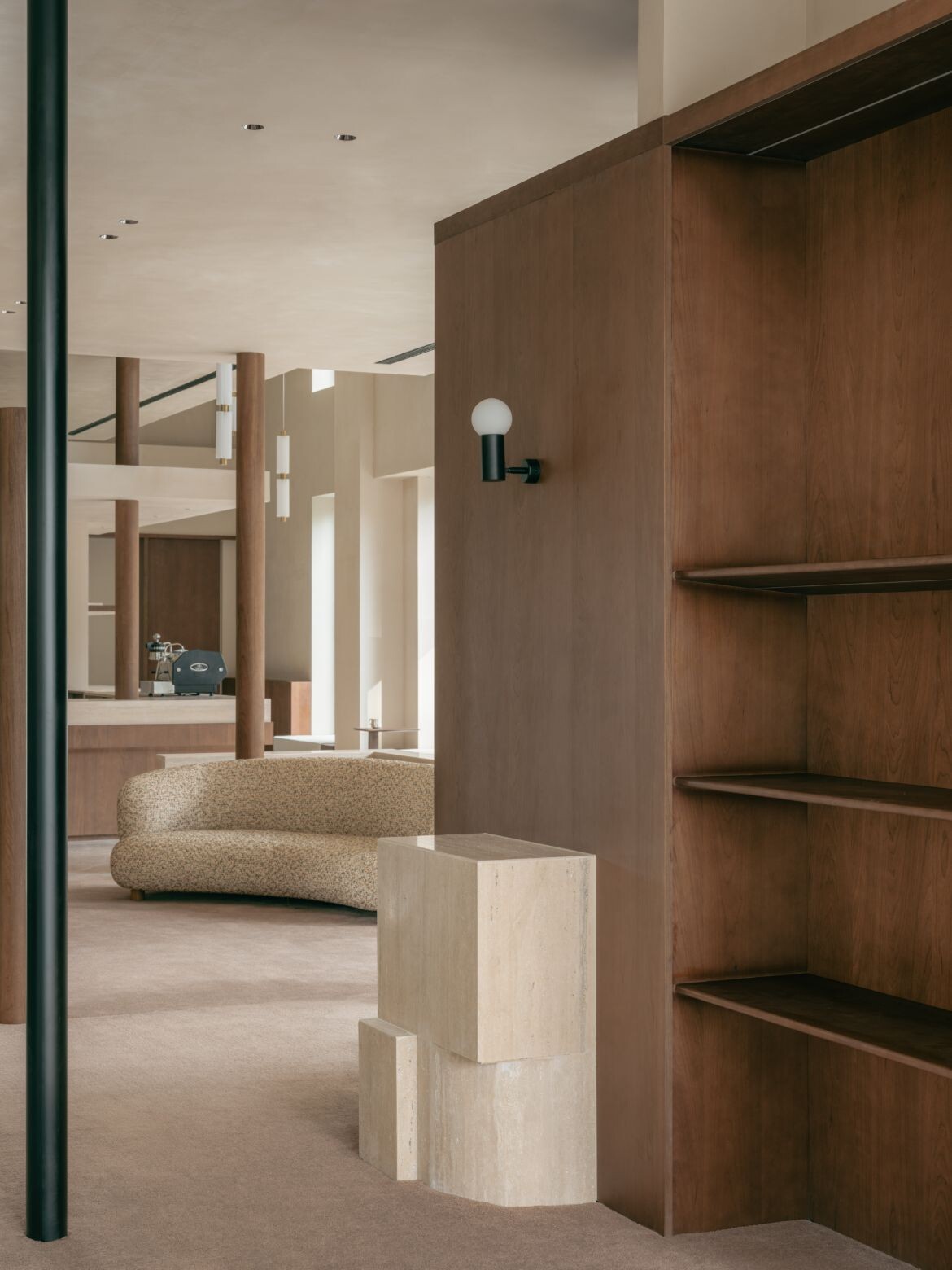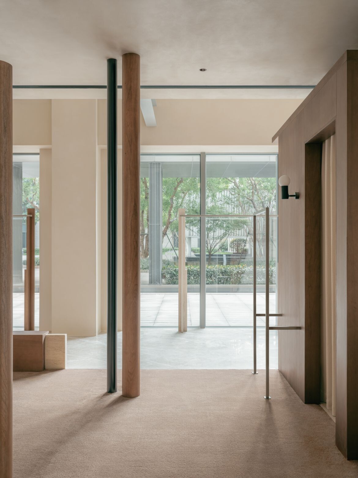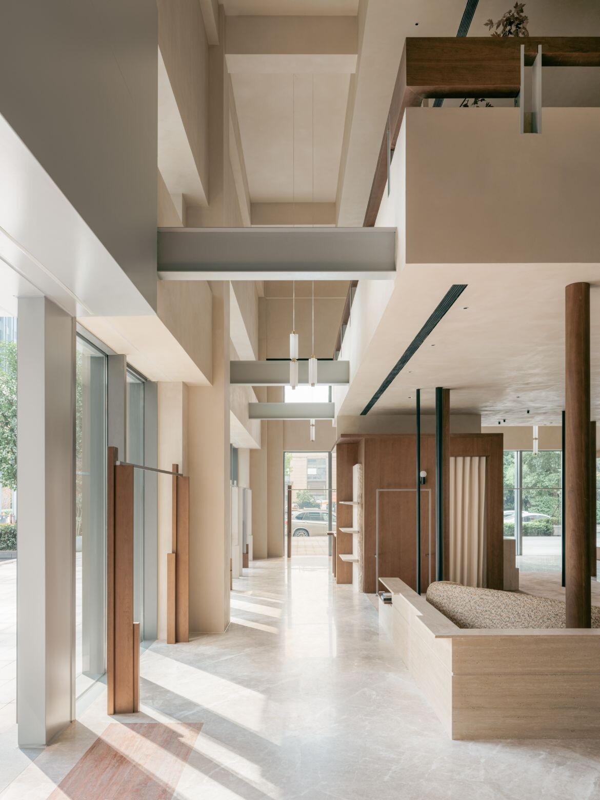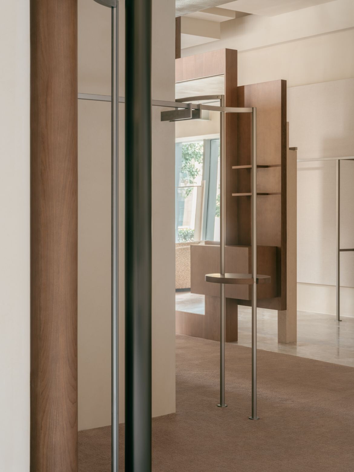The approach introduces dual rectangular volumes, assigning the outer glass views to distinct spatial units. Structural variation emerges through the interplay of staggered heights in these zones. The former ceiling height of seven metres is retained in the area near the glass façade, maintaining a sense of openness while preventing the space from feeling overly segmented. The latter is tiered, with a multifunctional second floor that accommodates display, office and storage functions. This zoning creates clear circulation pathways and keeps the open shopping area separate from more private spaces.