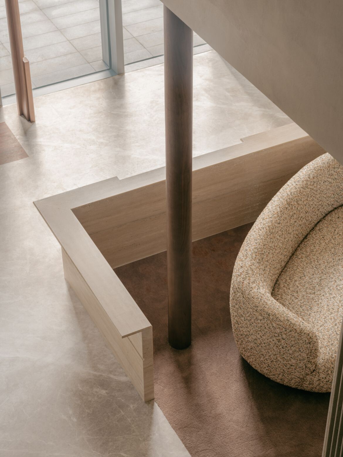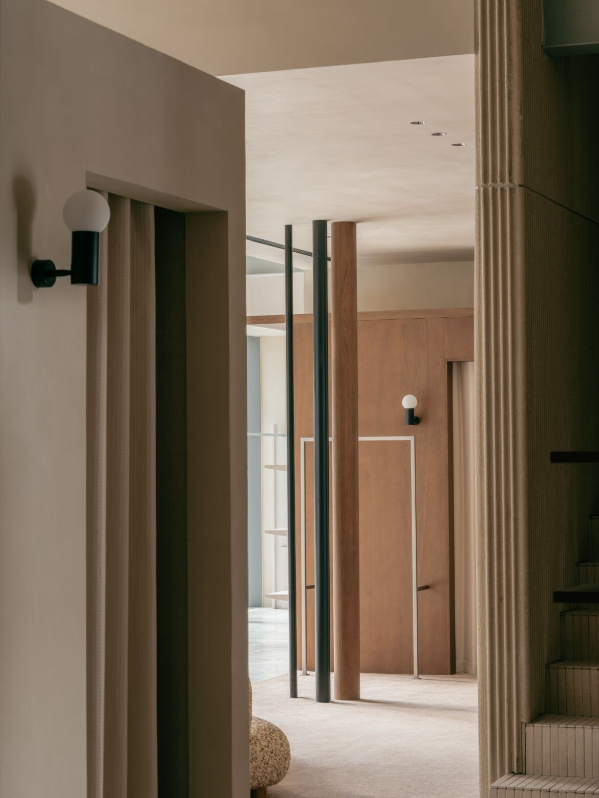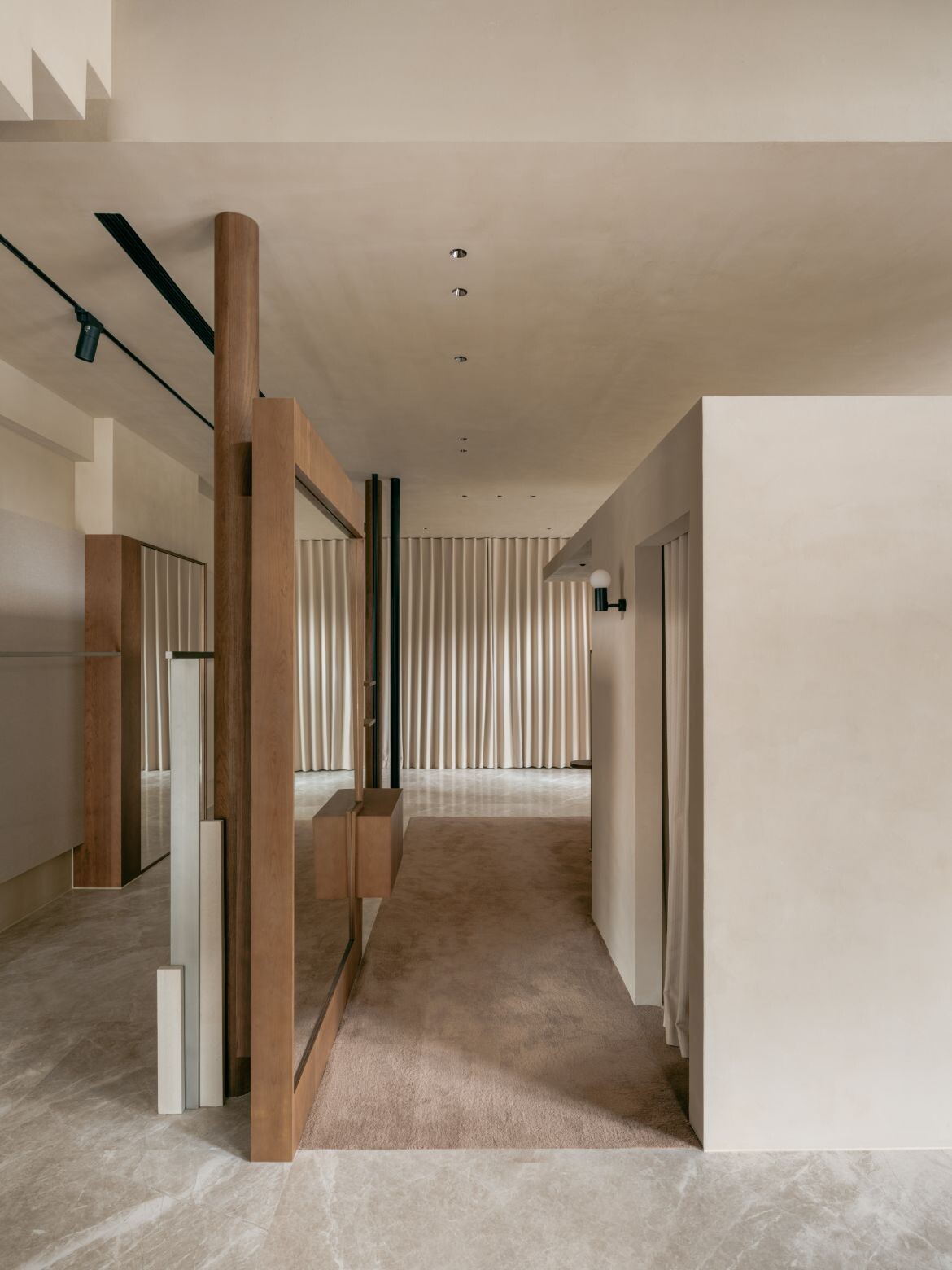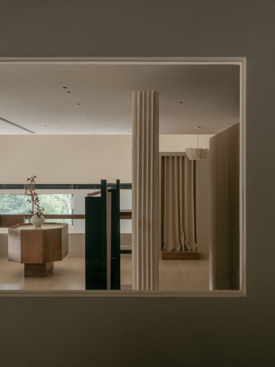 The approach introduces dual rectangular volumes, assigning the outer glass views to distinct spatial units. Structural variation emerges through the interplay of staggered heights in these zones. The former ceiling height of seven metres is retained in the area near the glass façade, maintaining a sense of openness while preventing the space from feeling overly segmented. The latter is tiered, with a multifunctional second floor that accommodates display, office and storage functions. This zoning creates clear circulation pathways and keeps the open shopping area separate from more private spaces.