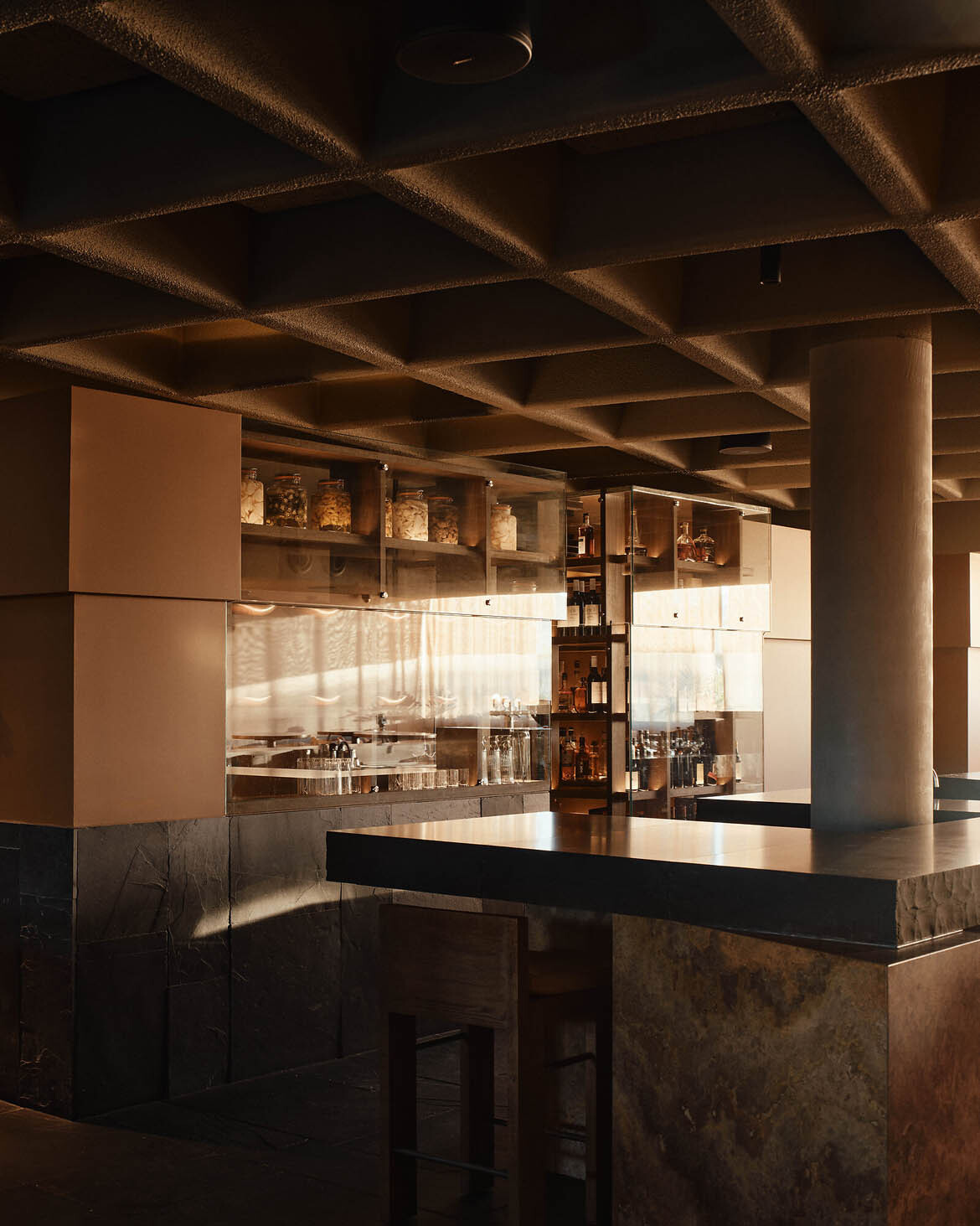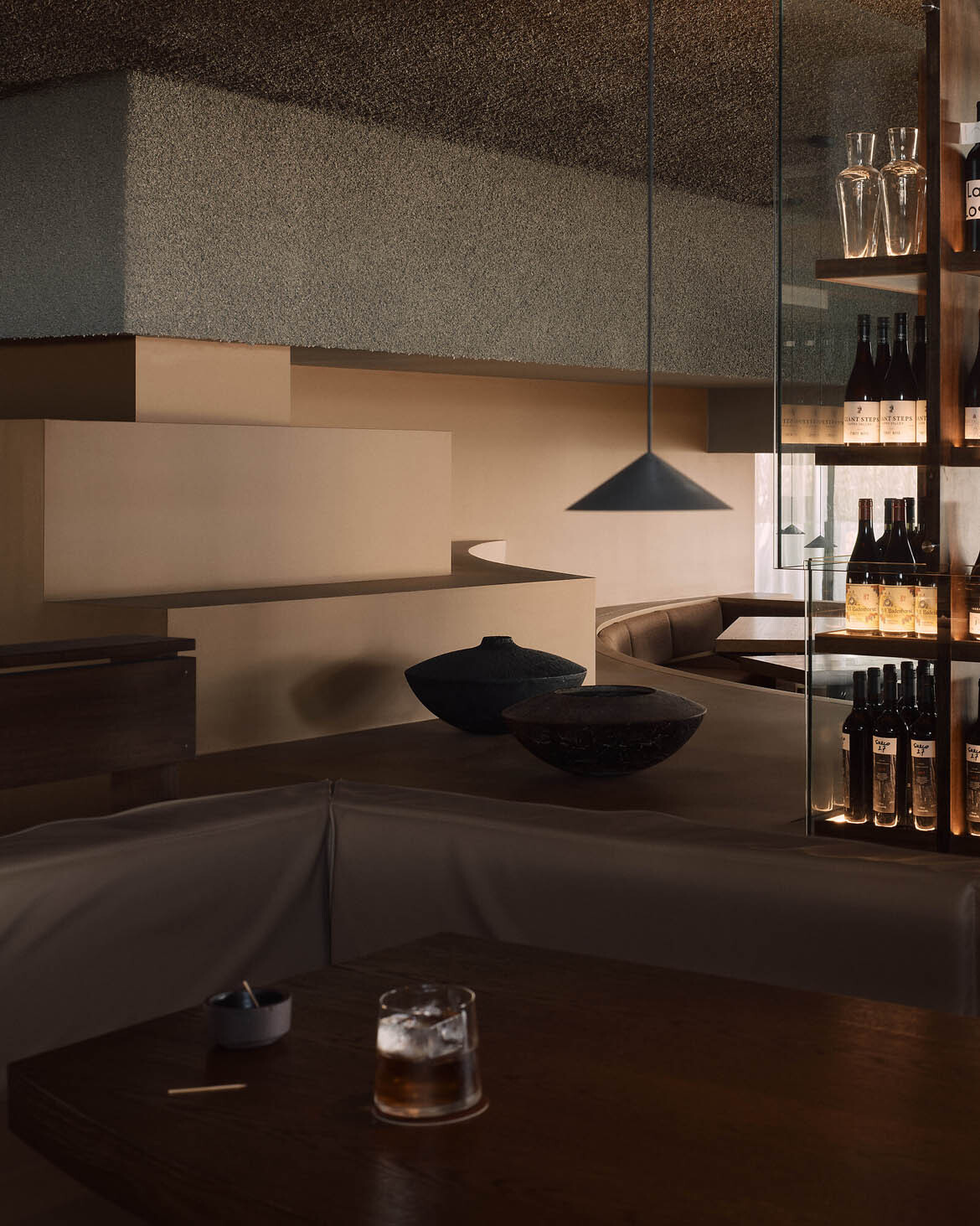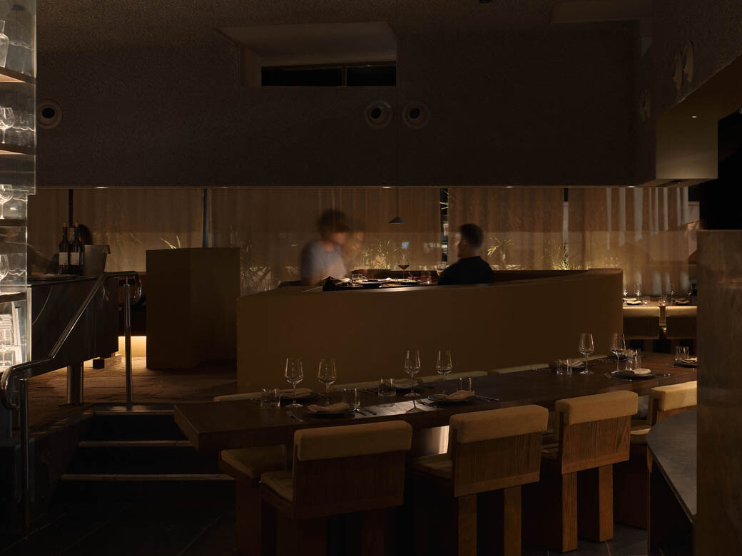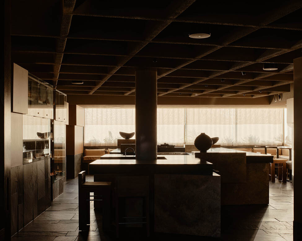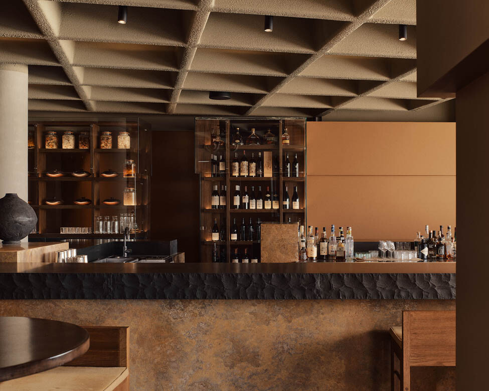 Every piece of furniture was designed in-house by J.AR OFFICE, rendered in generous proportions that evoke the unfussy geometry and material honesty of modernist design. The fabrics are deliberately chunky in their weave, expressing handmade character—local emerging textile designer George Park was enlisted to produce bespoke wall hangings. A waffle pod ceiling amalgamates the lobby, providing a hotel-like arrival sequence where guests are greeted and guided to their tables. Monolithic black granite benches and yellow travertine finished with stainless steel flourishes round out a material palette that is as considered as it is surprising.