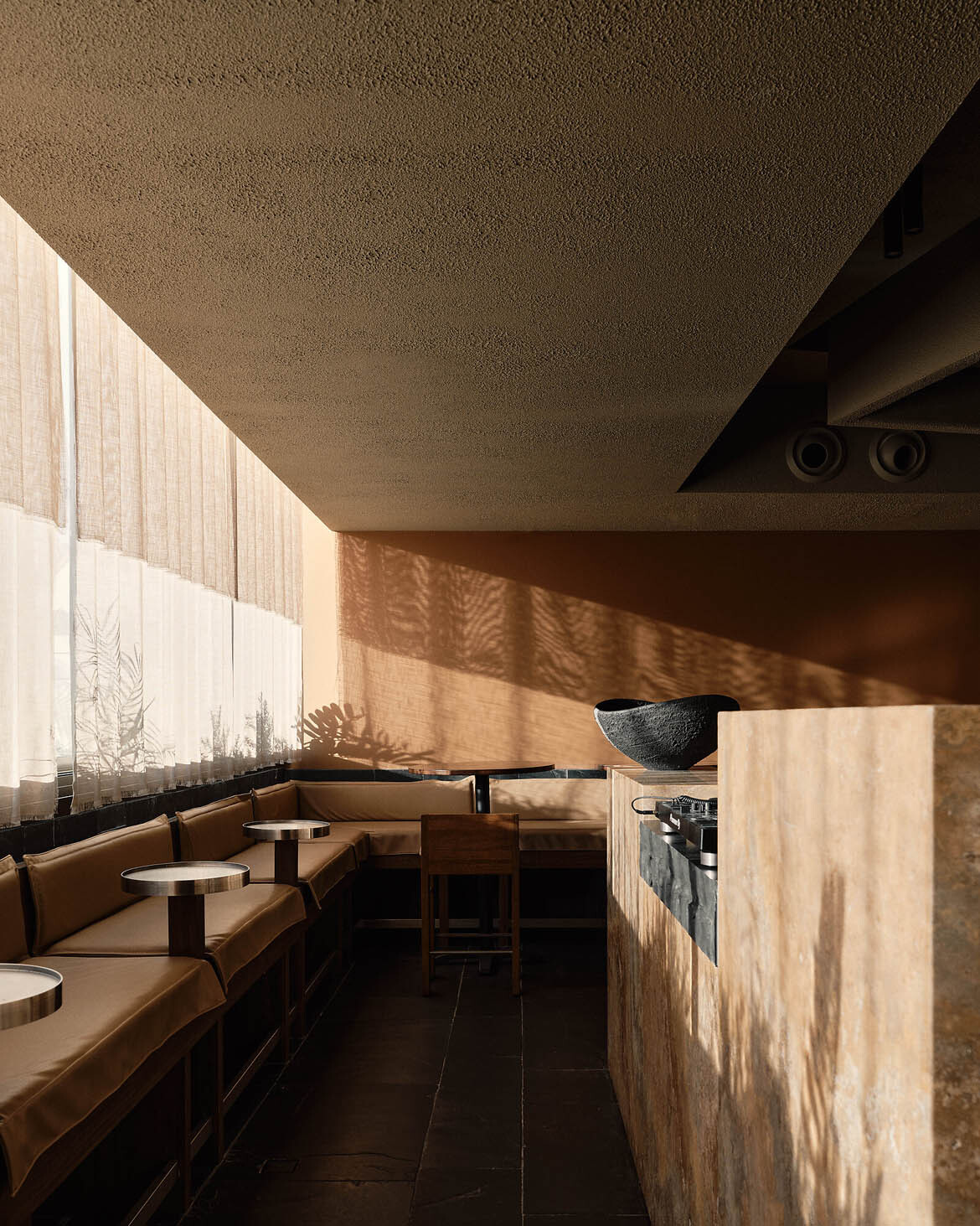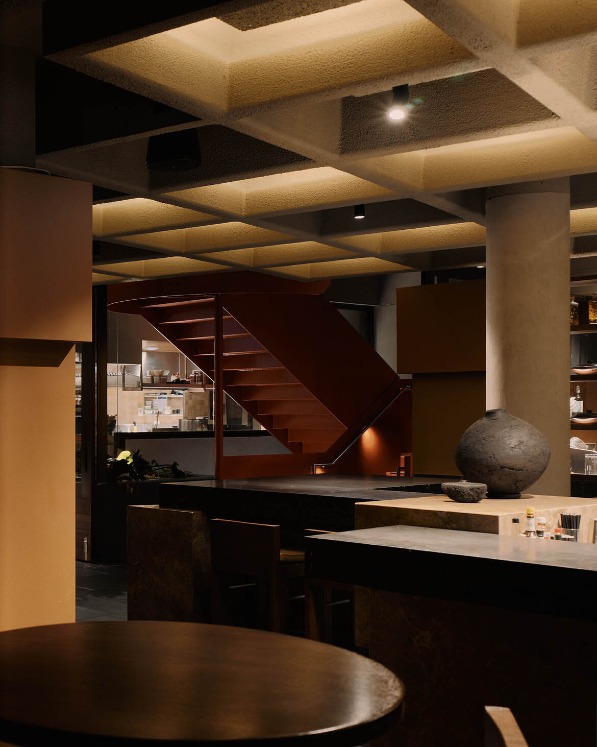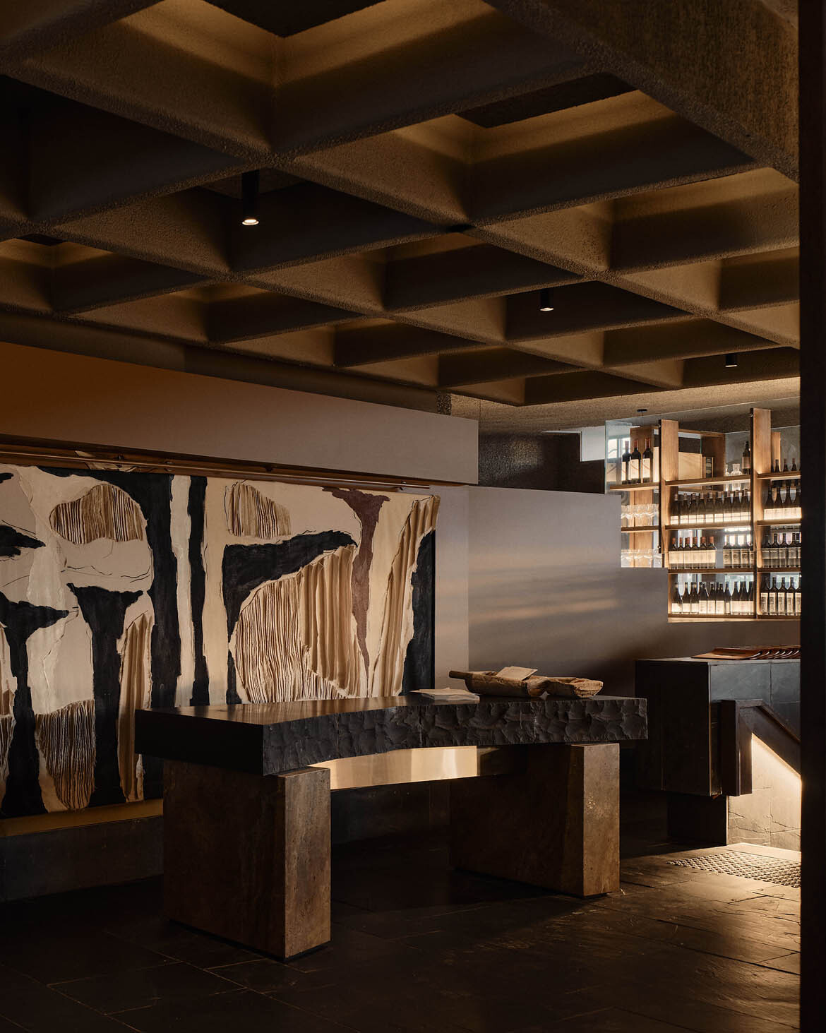 Every piece of furniture was designed in-house by J.AR OFFICE, rendered in generous proportions that evoke the unfussy geometry and material honesty of modernist design. The fabrics are deliberately chunky in their weave, expressing handmade character—local emerging textile designer George Park was enlisted to produce bespoke wall hangings. A waffle pod ceiling amalgamates the lobby, providing a hotel-like arrival sequence where guests are greeted and guided to their tables. Monolithic black granite benches and yellow travertine finished with stainless steel flourishes round out a material palette that is as considered as it is surprising.