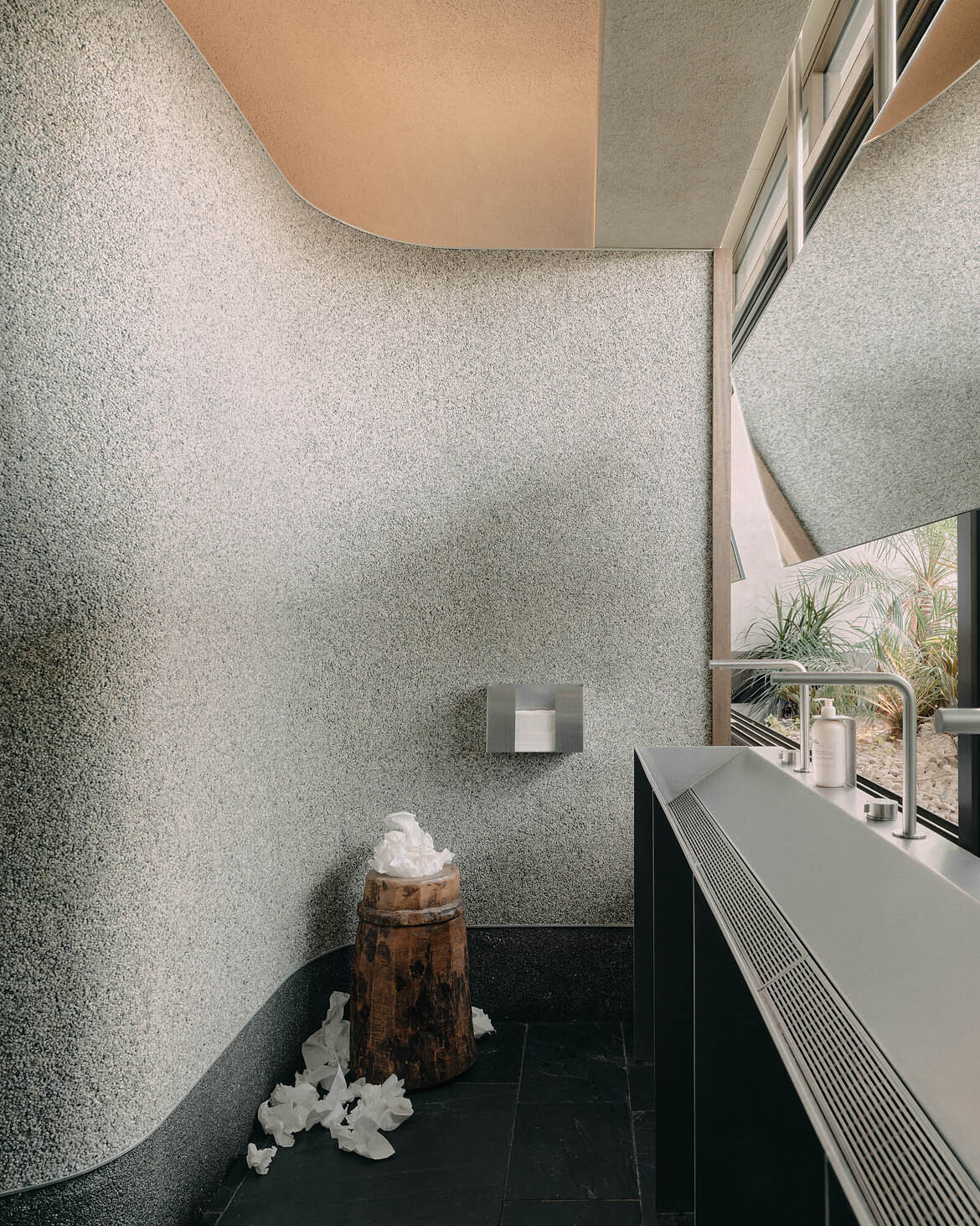 The design language is one of intentional contradiction. Black split-face slate—typically an external material—clads floors and walls throughout, bringing a robust, almost geological presence to the interior. This severity is softened by brushed walnut timber details, their grain expressed through matte wax finishes. High-gloss Mango Squash paint glows against the matte black surfaces. Sharp, clean wall datums meet cavernous, gently sloped vermiculate ceilings. Pebblecrete walls and red ceilings nod to the Gold Coast’s modernist resort heritage, a lineage often overlooked in favour of contemporary beach-house aesthetics.