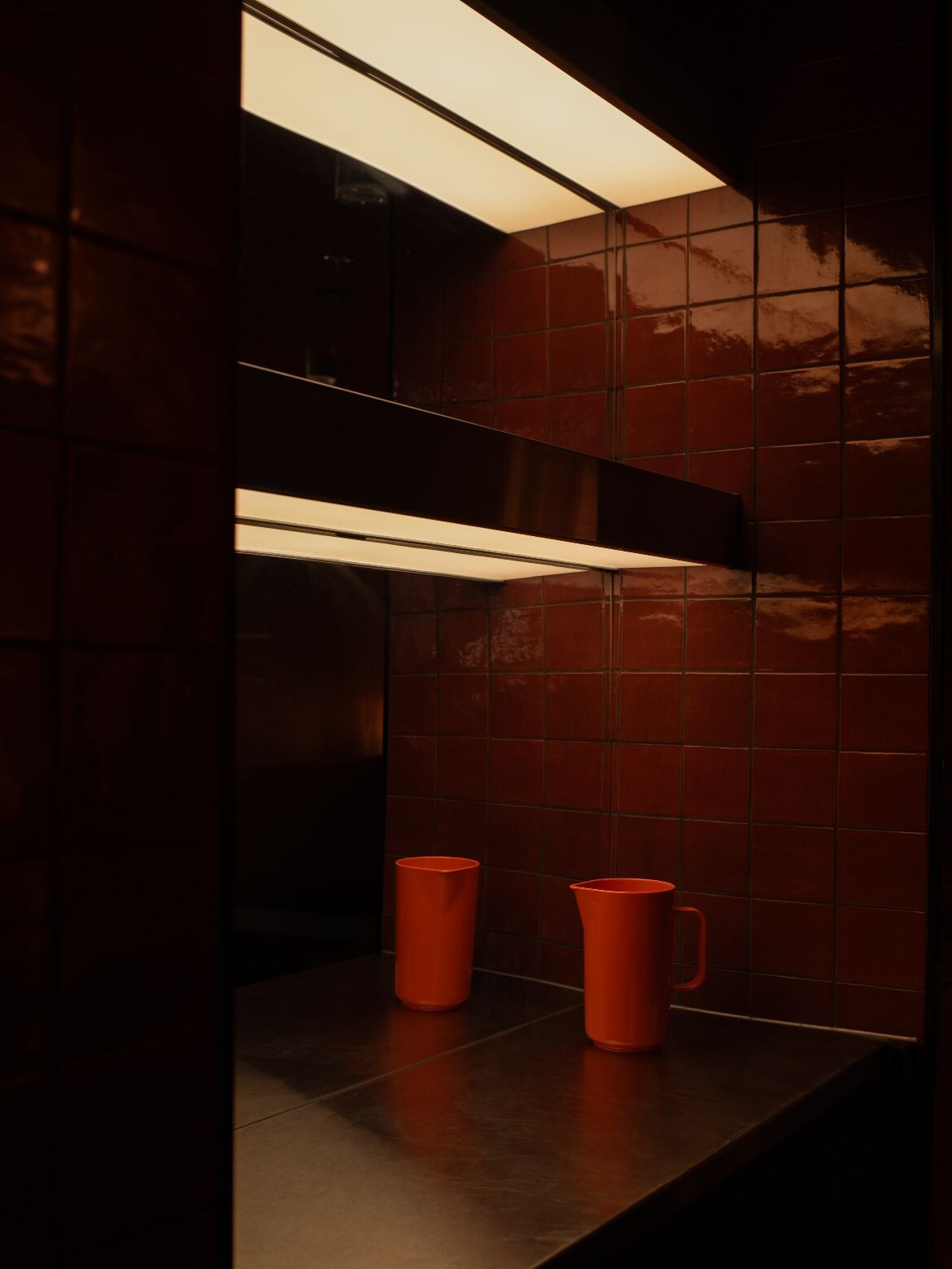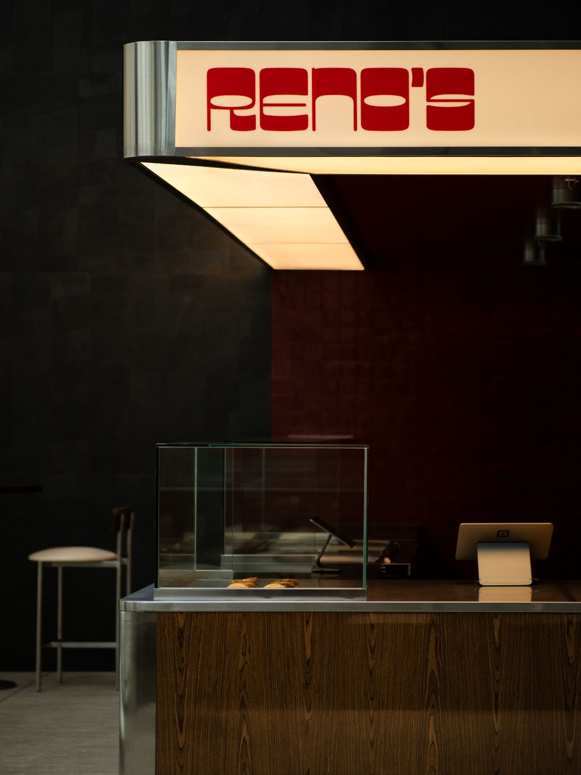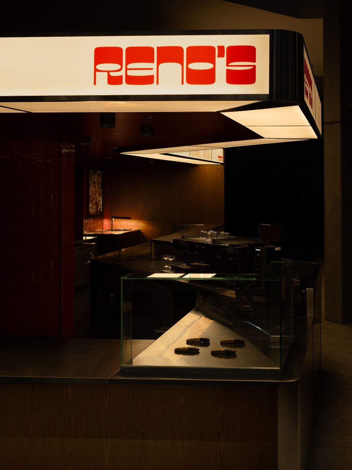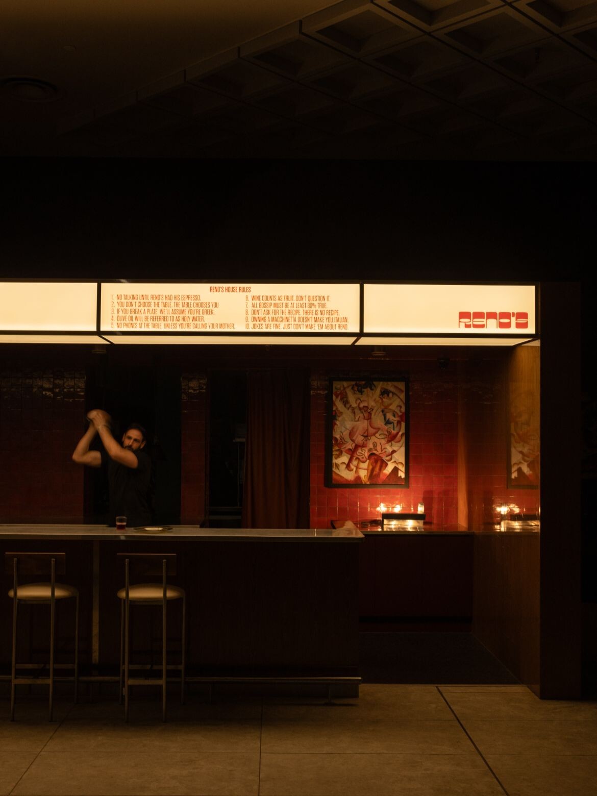 Inside, the tone shifts from the street – and away from the remainder of the re-invigorated building, designed by Studio Nine. A combination of heightened gloss timber, polished stainless steel and chrome details and the ripples in the tiled walls help to set the scene of Italian-inflected nostalgia. As a subtle transition from corporate lobby to hospitality venue, the material palette forms its own boundary and cocoons the space without the need for encasing walls. “We wanted people to feel the shift immediately [once inside],” Rowlands explains. “While still remaining part of the building at large, Reno’s Bistro has its own register, its own temperature.”