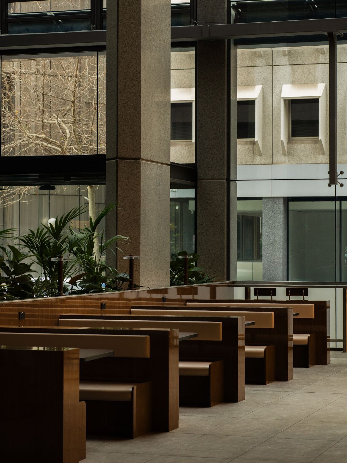 By operating across these threshold layers and acknowledging them in the approach to the design – street to bar, bar to lobby, lobby to tower – Reno’s Bistro also expands its role beyond servicing commuters and instead becomes an anchor for the building – as the place to arrive before work, reset between meetings, or return to at day’s end. In a city recalibrating its relationship with office life (post-pandemic), Reno’s Bistro demonstrates how hospitality can reshape the identity of a workplace – not as an add-on, but as a cultural offering in its own right.