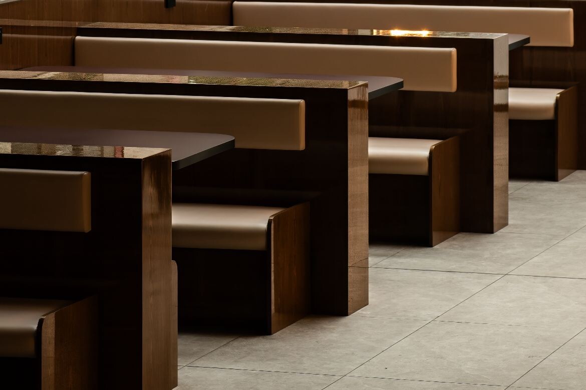 The lobby then becomes a mediating device. A combination of generous volumes are compressed near the floating light box, reducing the scale of the lobby and creating a feeling of separation and seclusion from the front-of-house and broader circulation paths. Smaller pockets of banquette booth seating facilitate everything from informal meetings to quiet retreats, with generous proportions to stay and linger, and not feel rushed. “The design was about creating places where you can choose to be visible or to remain discreet,” Rowlands says. “That duality is central to how the space works.”