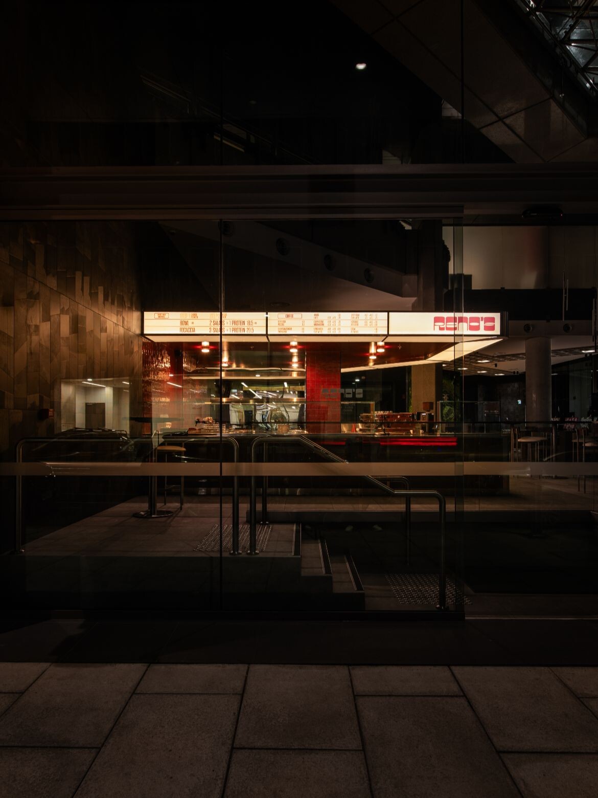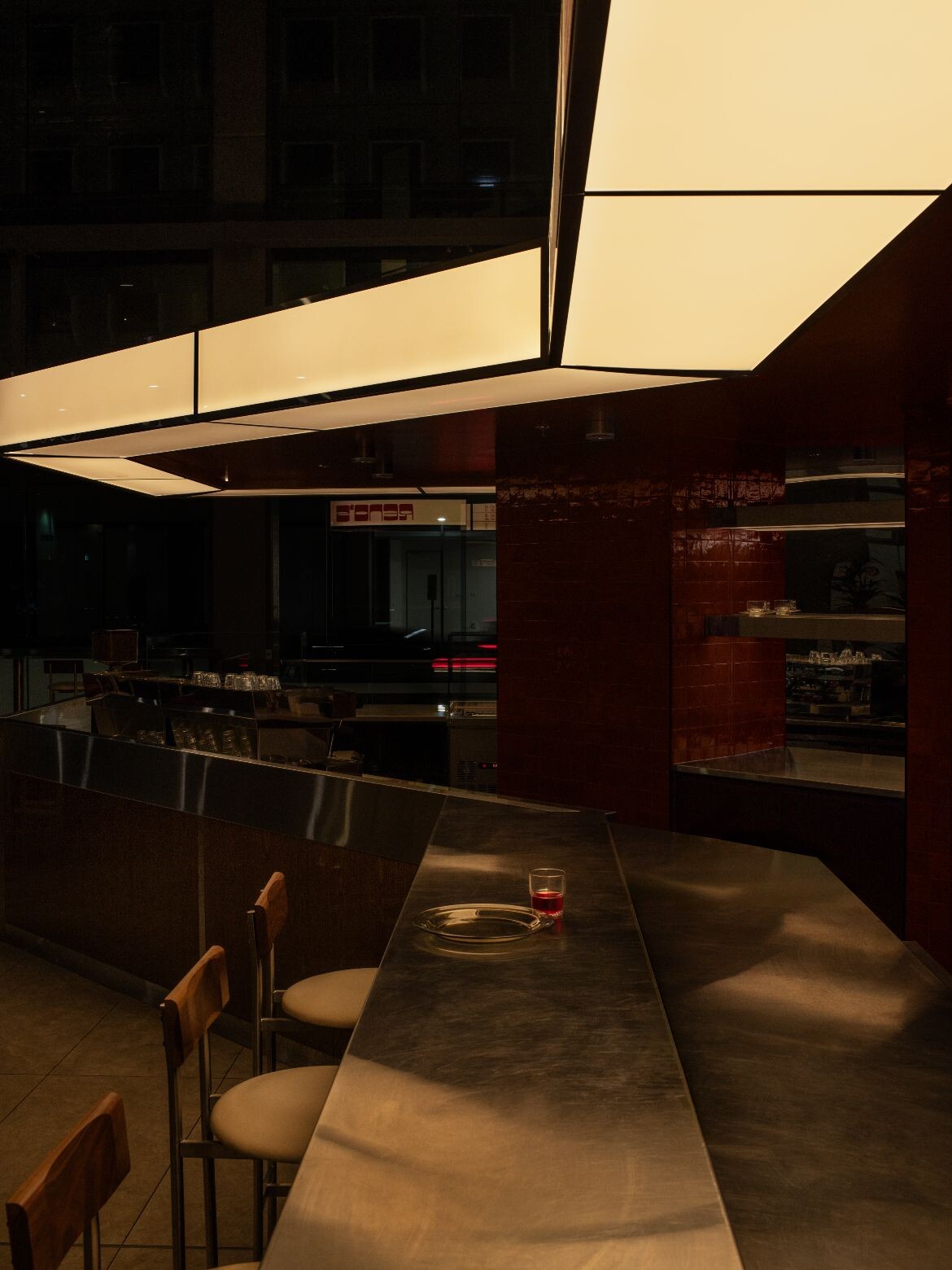 From the street, Reno’s Bistro presents as a deliberate interruption to the commercial façade: polished steel, sculptural lines and a warm glow that signals activity from mornings until late in the evening. The bar itself sits directly on the threshold between the street and the building, operating as its own attractor. “It was important that the café didn’t feel hidden within the tower,” Rowlands notes. “The grab-and-go bar is positioned to encourage pedestrians to be drawn inward – even if their destination isn’t the offices upstairs. There is a balance between being seen, while also being subtle enough.”