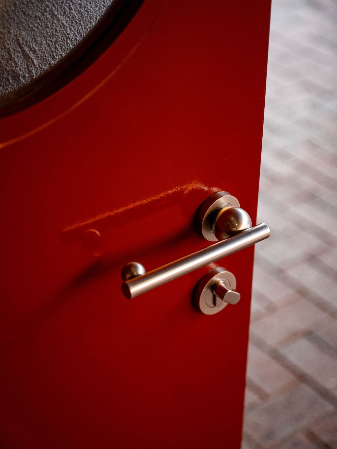 At the centre of the tight space sits an expressive gesture: a deep red, zig-zagging concrete counter. It operates both as an anchor and inflection point, as a single saturated departure from an otherwise restrained palette.