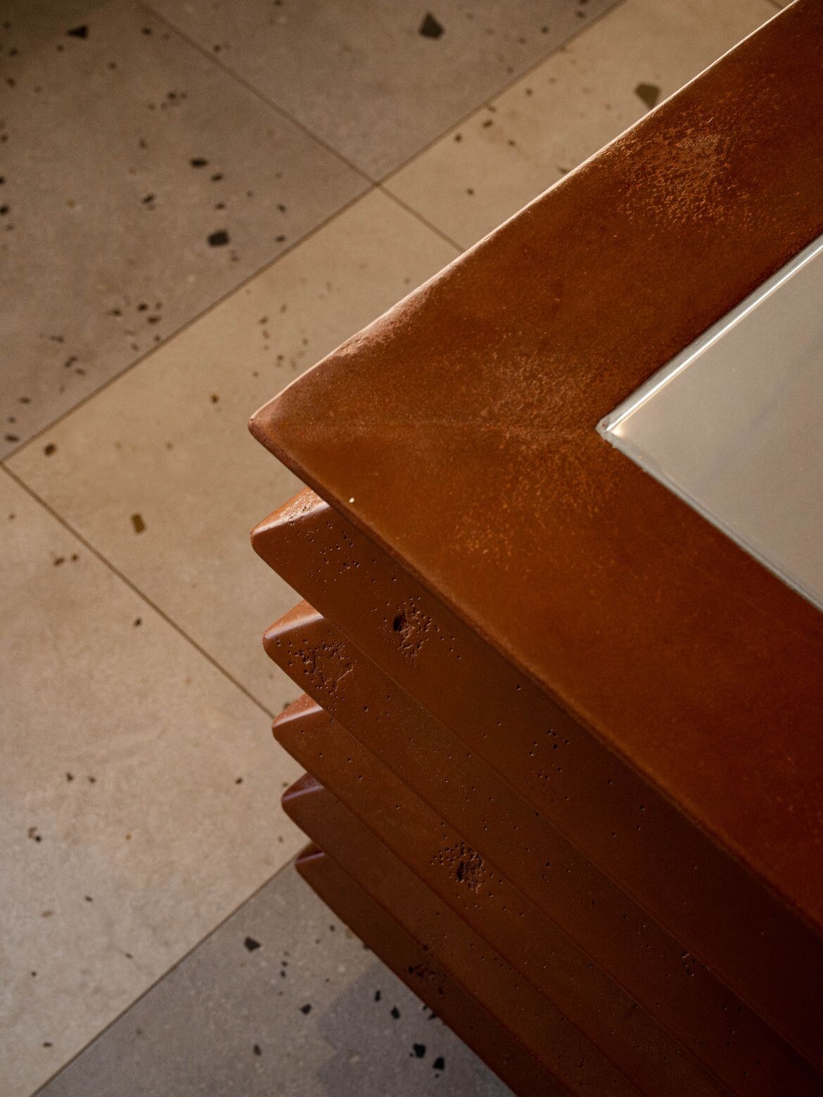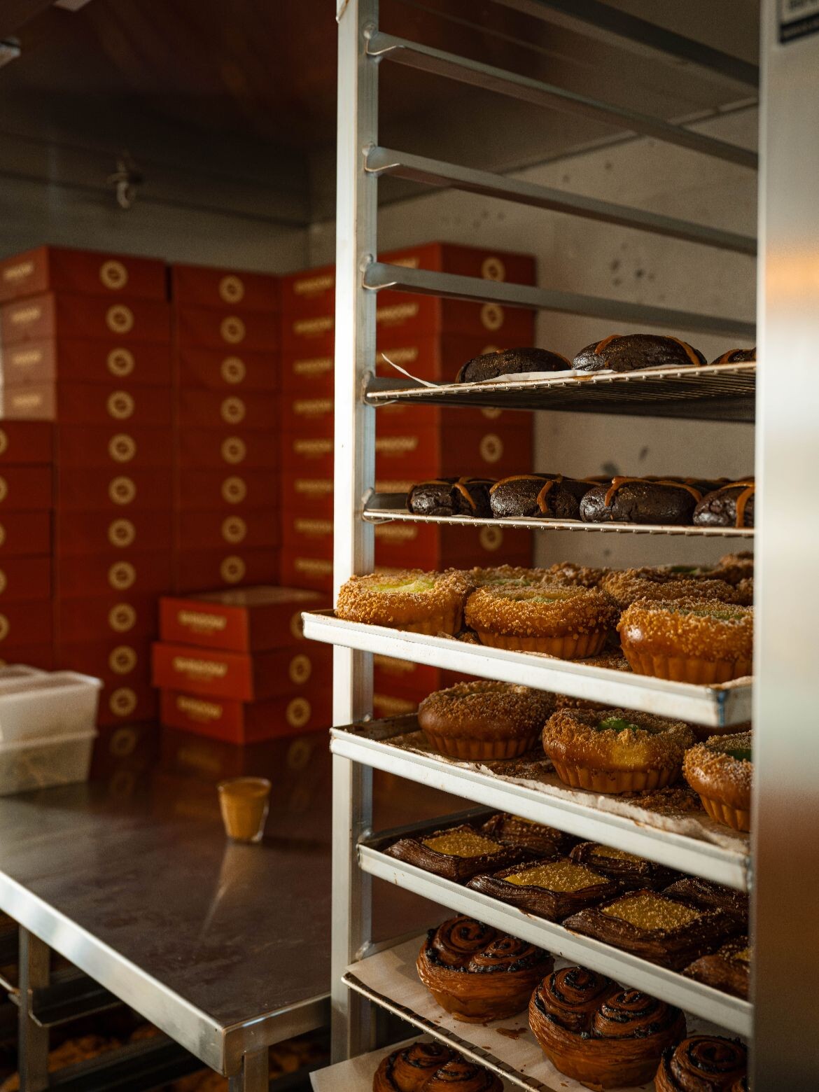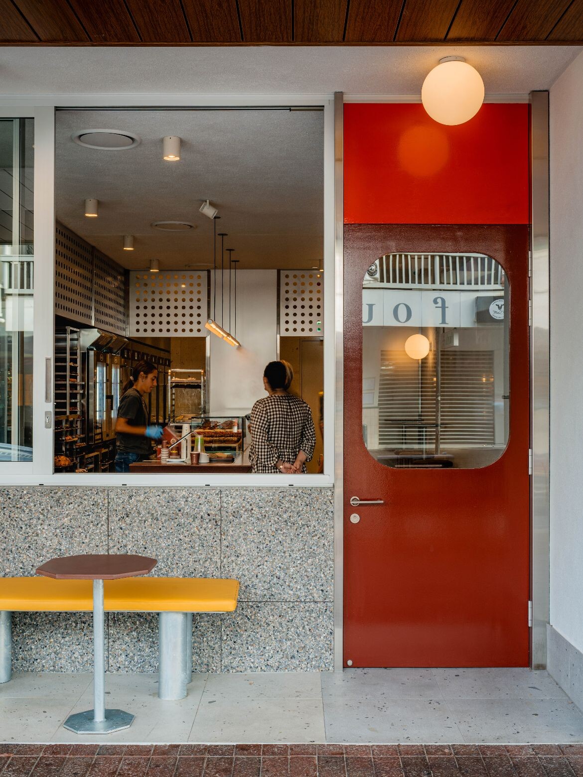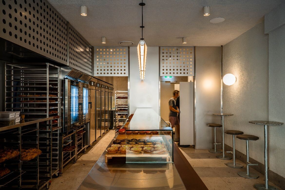 “The form is inspired by a layering and stacking reference (to baking itself),” Marovich notes, likening the counter’s folds to the lamination of pastry. “It remains as the one focal piece of colour, with everything else remaining quite muted and recessive that surrounds it.” Deliberately sculptural while also grounded through the inherent weight of the concrete itself, the form supports the overall offering both functionally and symbolically. It is the surface where the work of many hands arrives in its final state.