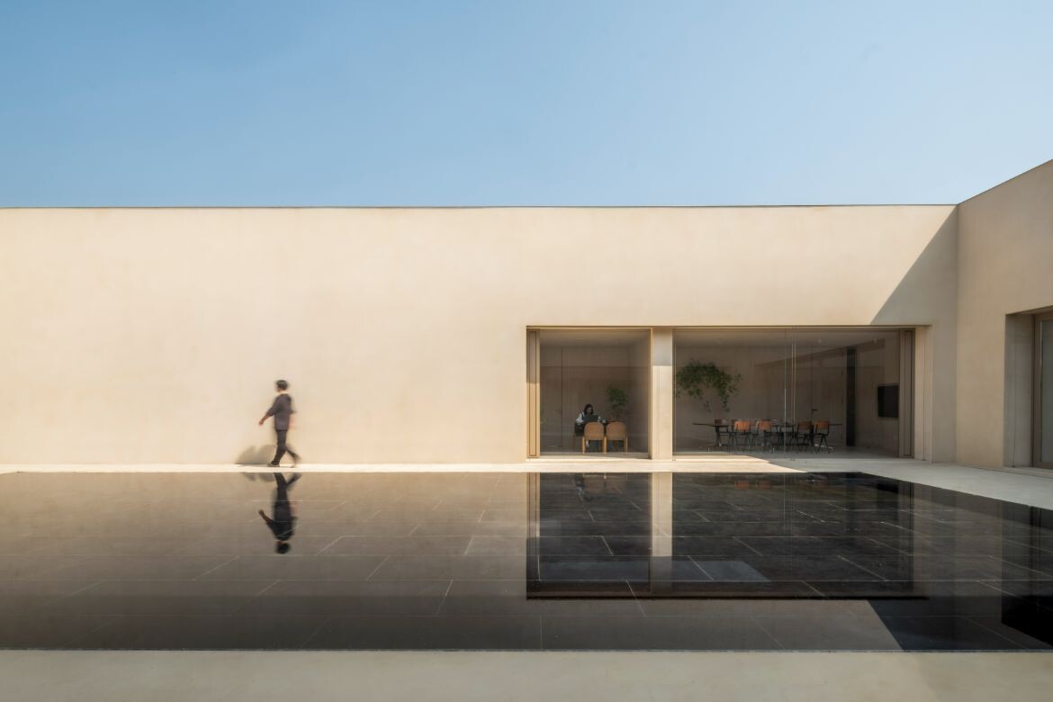 At the centre of the project is a raised open courtyard with a shallow reflective pool lined with black pavers, surrounded by windows as well as large open social spaces. Reflecting the sky and clouds, it is peaceful and contemplative space. “As the breeze gently passes over, ripples form on the water, almost as if filtering out the city’s noise and creating a serene atmosphere,” says Han Wenqiang. However, it is also practical and designed to be easily drained with ports for anchoring a marquee when social events take place.