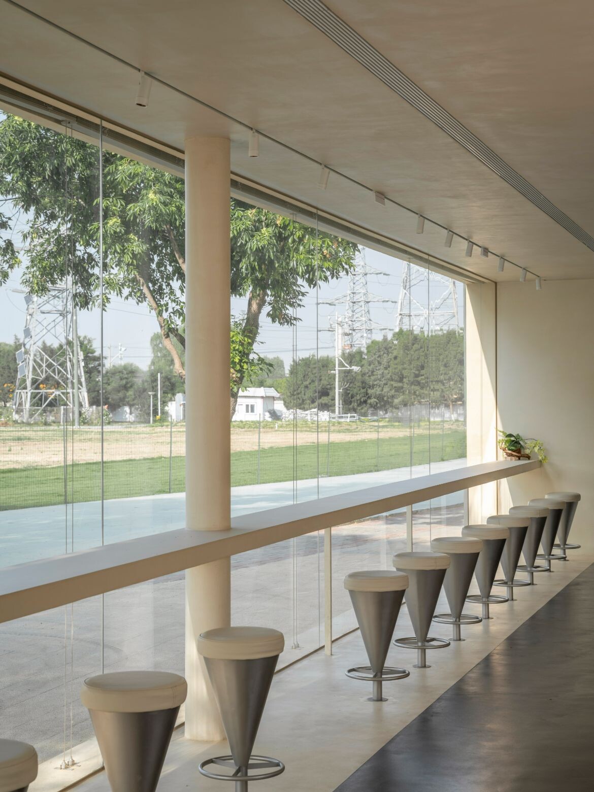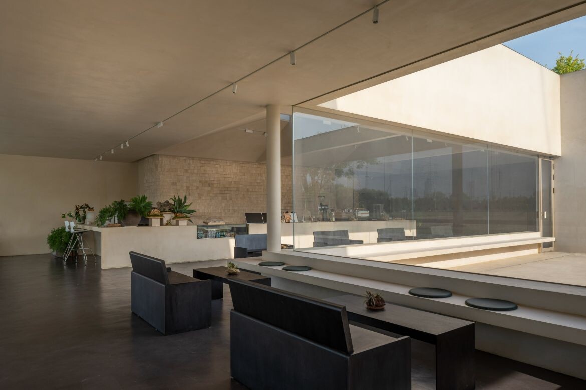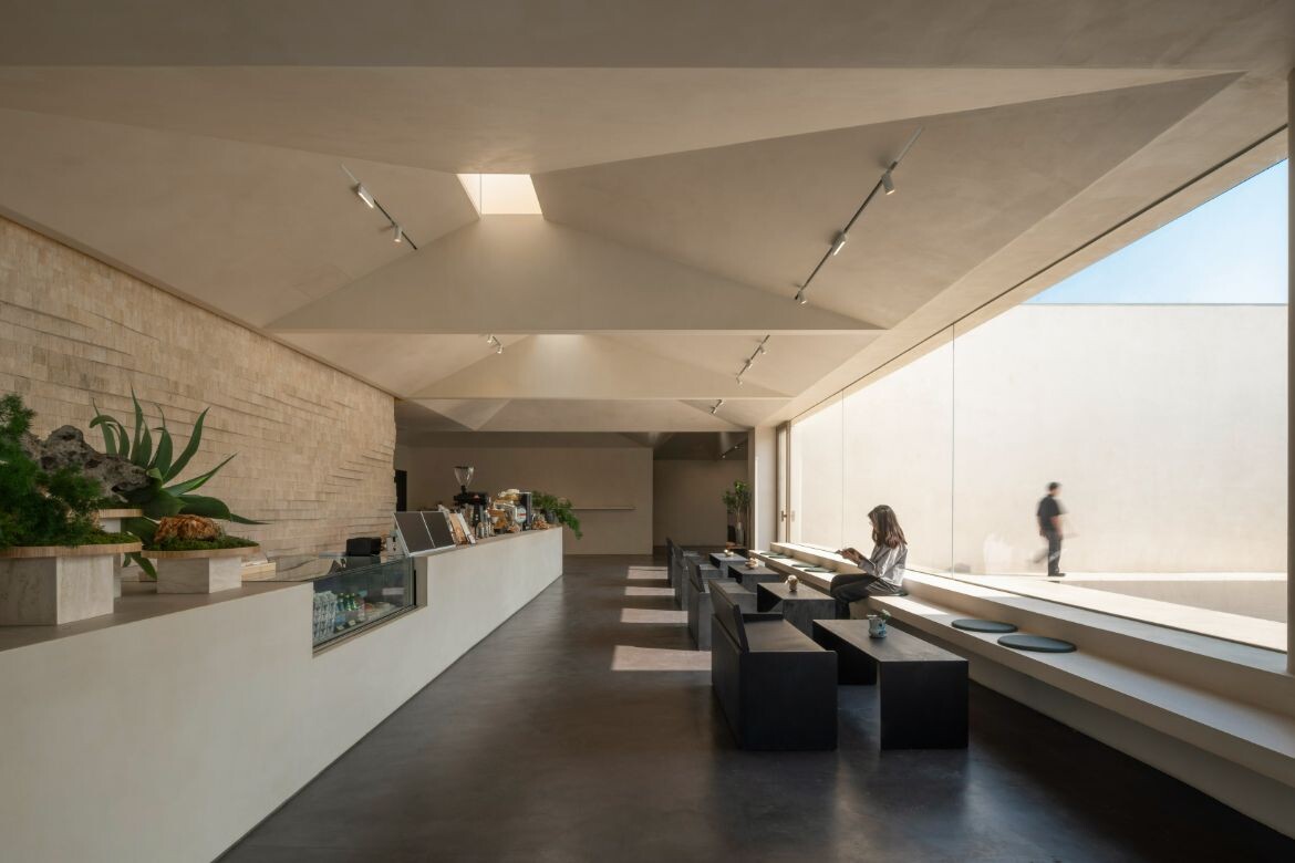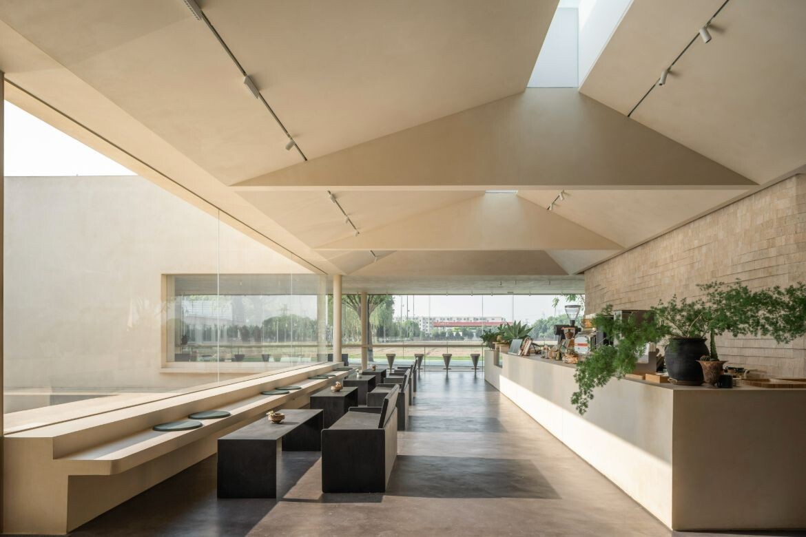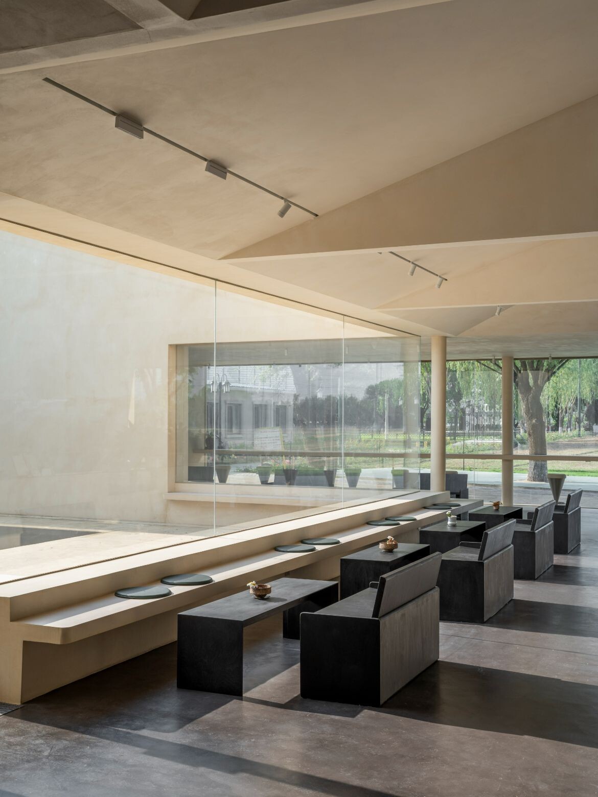 The adjoining café looks onto the pool and is sublimely tranquil in its own right with in a pale travertine shade paired with polished black cement floors that echoes the reflective pool. The picture windows here are particularly long on all sides to add an extreme horizontality to the whole, while bringing the view fully within the space. The bespoke built-in furniture is elegant and resolved with their boxy formality suiting the project well. “This design blurs the boundaries between furniture and architecture, promoting a smooth, natural flow within the space,” says Han Wenqiang. A wall of pale stone blocks undulates in a subtle three-dimensional expression behind the serving counter, which is, as expected, refined and unadorned.