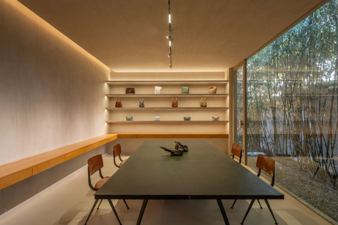 Tasked with attracting visitors to the site within the cultural and creative park on the outskirts of Beijing (Dong Yugan’s incredible Red Brick Museum is nearby), Han Wenqiang set about creating an immersive brand experience. The location itself is an emotional remove from Beijing’s hustle and bustle, with tranquil parklands, open spaces and views to the mountains. And Han Wenqiang has invited this in with a multi-use space and brand destination that integrates multiple functions, including café, store, workspace, exhibitions, receptions, meetings, photo shoots and livestreams.