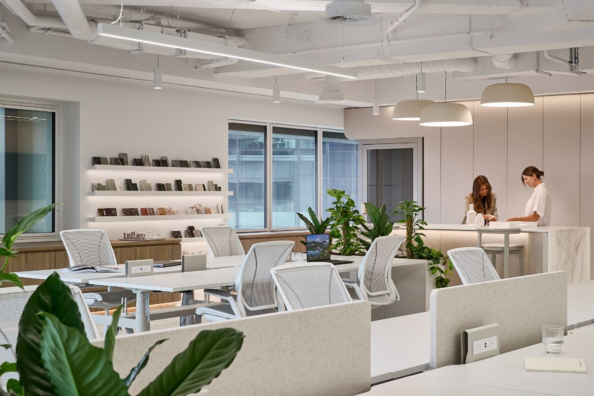 To allow for all the designers and builders’ inputs, rigorous staff surveys were conducted, capturing the teams’ needs and aspirations for the new space, as well as frustrations with their old offices. The feedback revealed that McCormack was looking for a “warm, sophisticated and more hospitality-driven” design, says Serruto. Meanwhile, Studio 103 “wanted something fresh and wellness-focused.” Both teams were looking for spaces that support collaboration and performance.