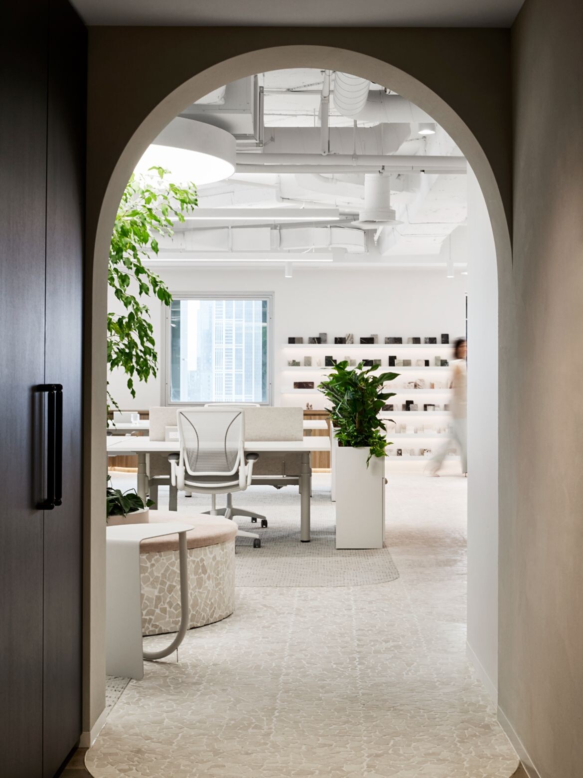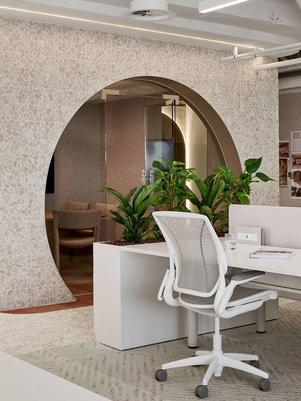 In McCormack’s office, darker timbers, textured finishes and leathers were chosen. While Studio 103’s space contrasts this with lighter timbers, a consistent use of white and natural tones and terrazzo style tiling on the floor. The arched and circular doorways and curved inbuilt shelving nooks and cabinetry also add a distinctive and fresh feel. Both teams drew on their strong relationship with suppliers which “allowed us to explore a wide range of finishes across joinery, furniture, flooring and walls – it was a real privilege,” reflects Serruto.