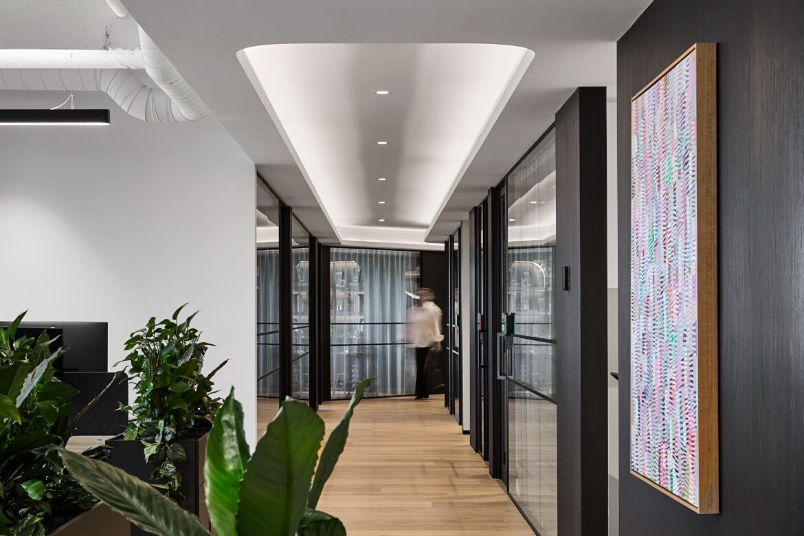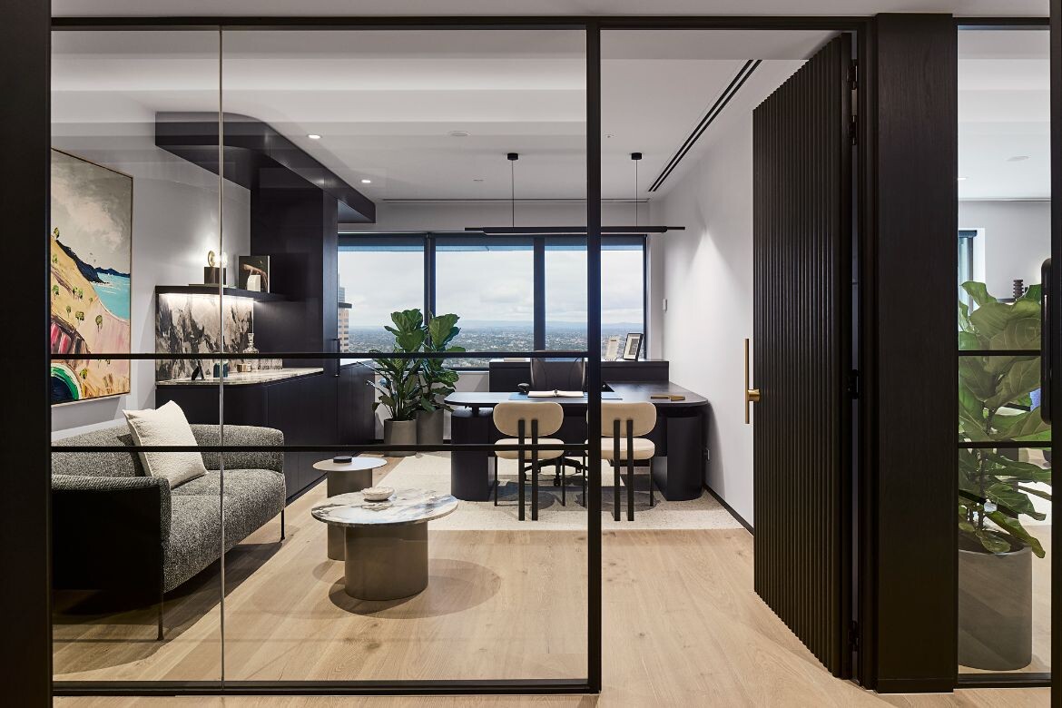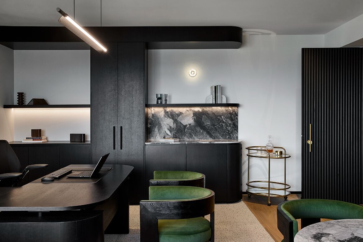 Some of the outcomes of this freedom included adjusting meeting room sizes once demolition revealed extra space, refining the ceiling heights and lighting details to conceal fixtures more elegantly, incorporating builder and trade feedback on site around centring furniture, resolving wall thickness and optimising joinery detail. “This freedom allowed the final product to be even more refined than the original plans,” Serruto reflects.