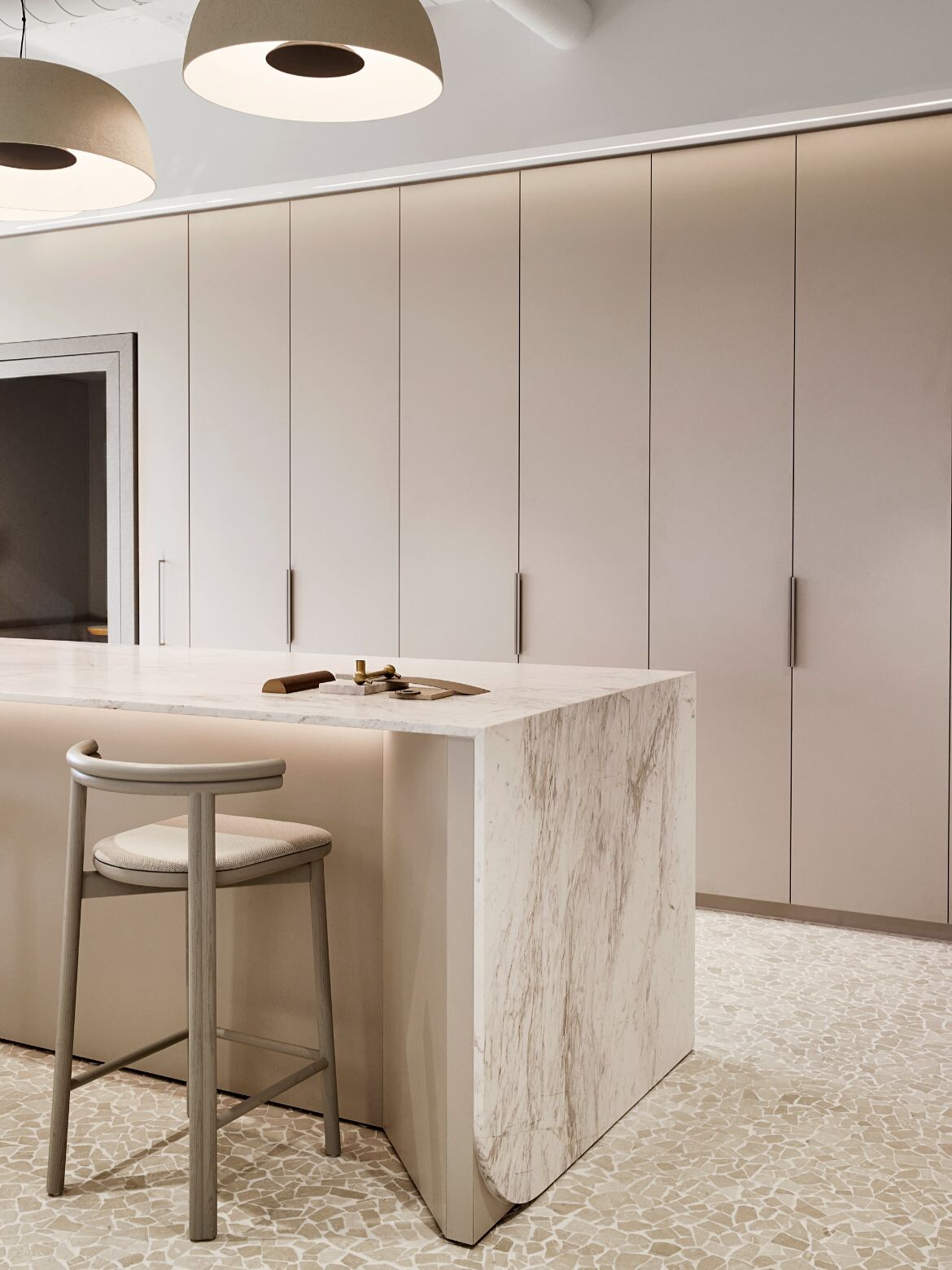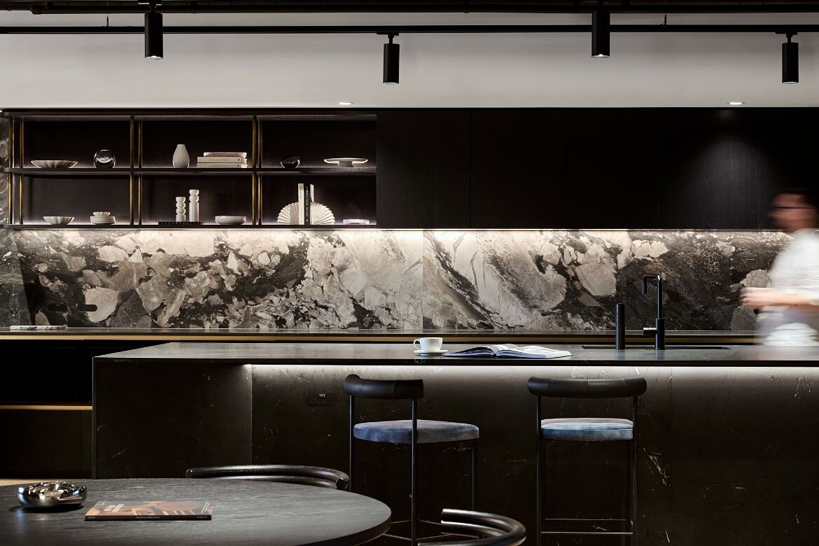 While the two offices differ in feel, it was integral to both that the finishes, details and fittings were well refined as the spaces will be used as a kind of working showroom to demonstrate the possibilities and qualities of diverse material application to clients. “Every material, finish and detail, from textured walls to a single door handle, was intentionally chosen to create layered, purposeful zones,” says Serruto.